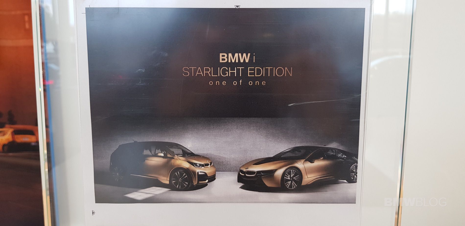 The golden ambience of the Starlight Edition is also featured behind the wheel. Selected interior elements, such as the center panel, the ventilation exhausts and the steering wheel logo are finished in gold paint. In addition, also the door sills use the special lettering “BMW i8 / i3S Starlight Edition One of One” to highlight the exclusiveness of both cars.