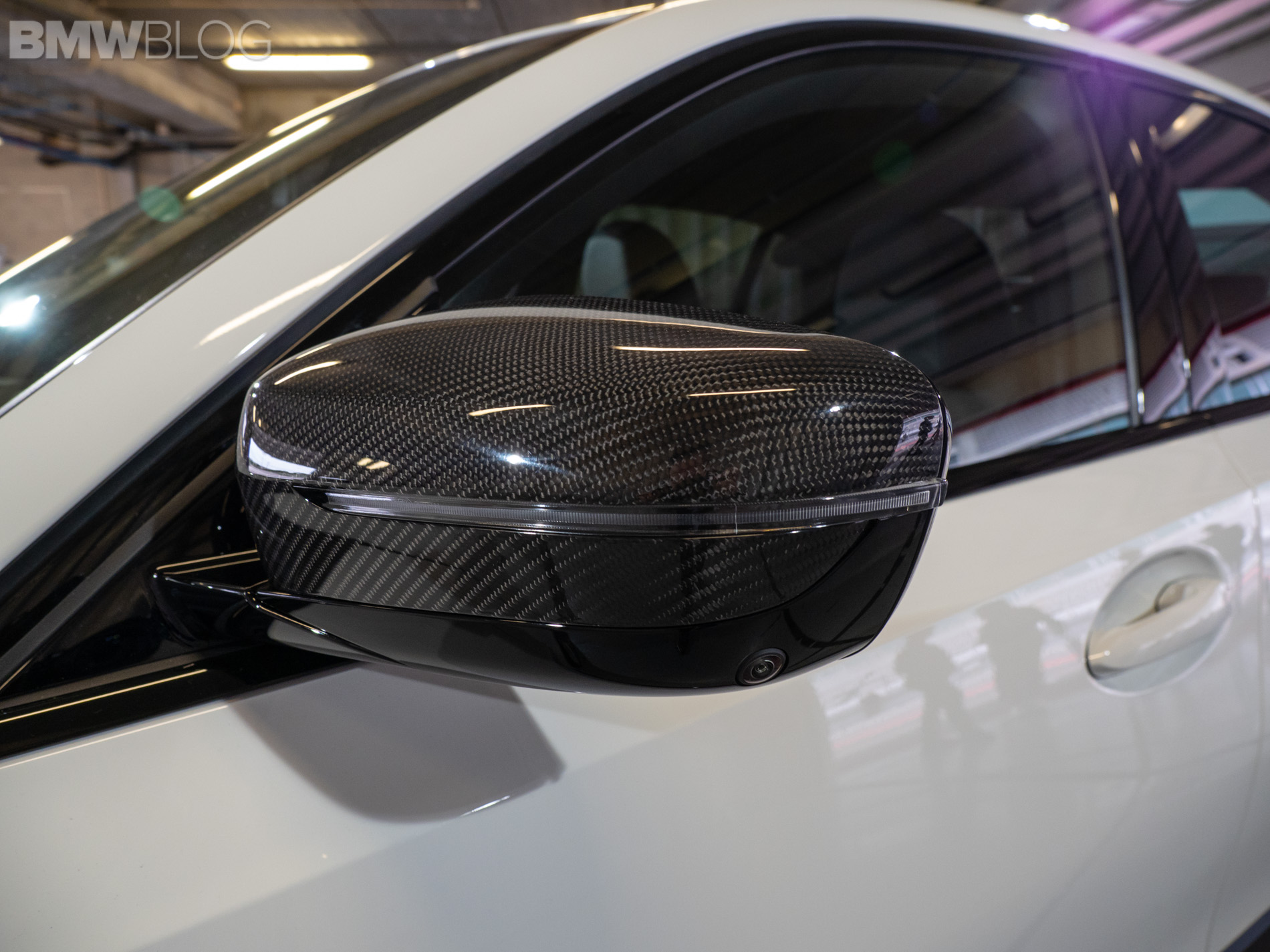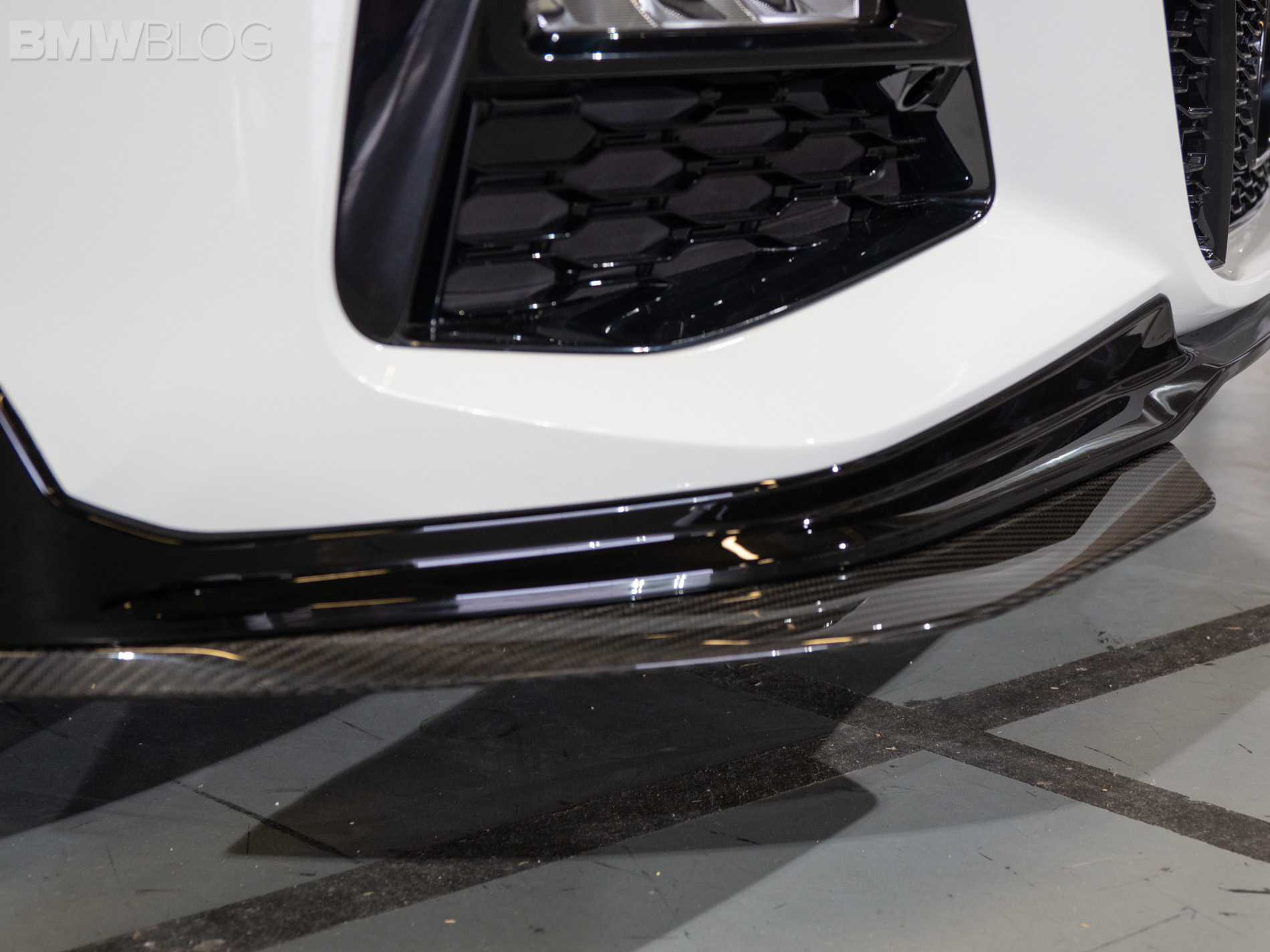 As seen below, there’s an M Performance front splitter along with a rear spoiler an diffuser. All of these parts are available in a choice of carbon, black high-gloss or black matte and optimize the air stream around the vehicle while reducing uplift. The M Performance exterior mirror caps made of carbon fiber are also available as are the M Performance side sill films. Last but not least we should mention the grey back lights and M Performance tailpipes.