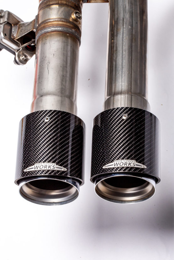 For that racing inspired look, the tuning kit can be fitted with a choice of JCW Chrome or Carbon Fiber tailpipes.