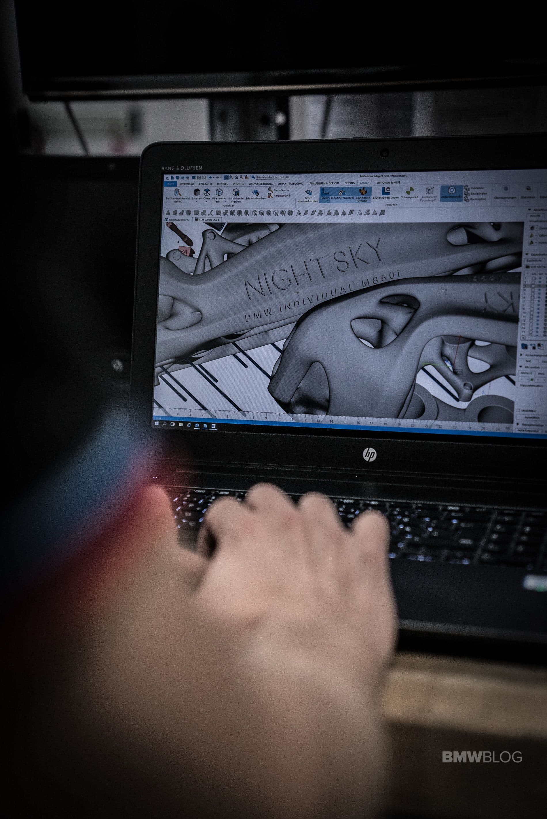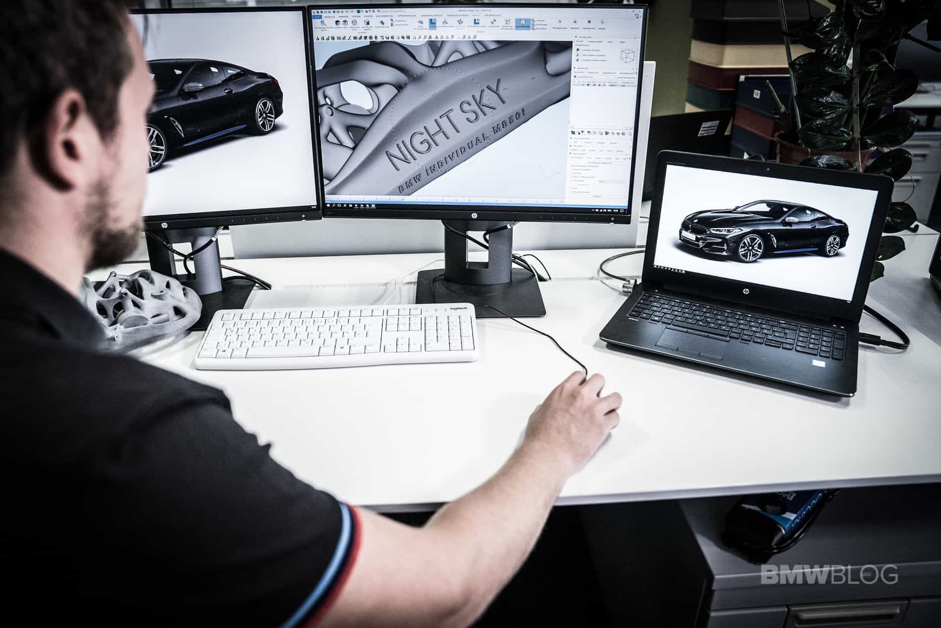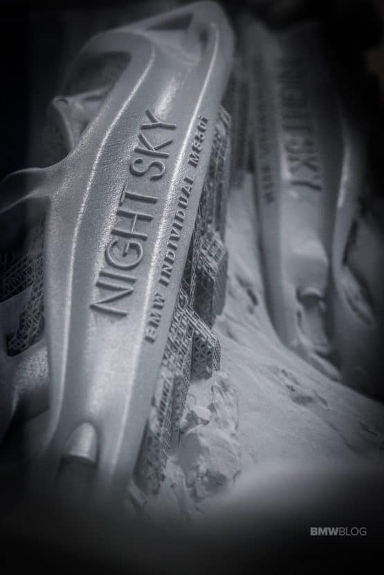 The singularity of the Widmanstätten structure is symbolic of BMW Individual’s ongoing pursuit of innovative design solutions never seen before. Visible in the hand-stitched headliner and on the centre console’s trim finishers, it has also been milled into the brake discs of the BMW Individual M850i Night Sky. This distinctive meteorite pattern can also be found on the exterior mirror caps, the front splitters for the side air intakes at the front of the car, the centre mesh plate and the surrounds for the Air Breathers on the front side panels. These exterior components were all specially developed for the BMW Individual M850i Night Sky and individually manufactured using a 3D printing process.