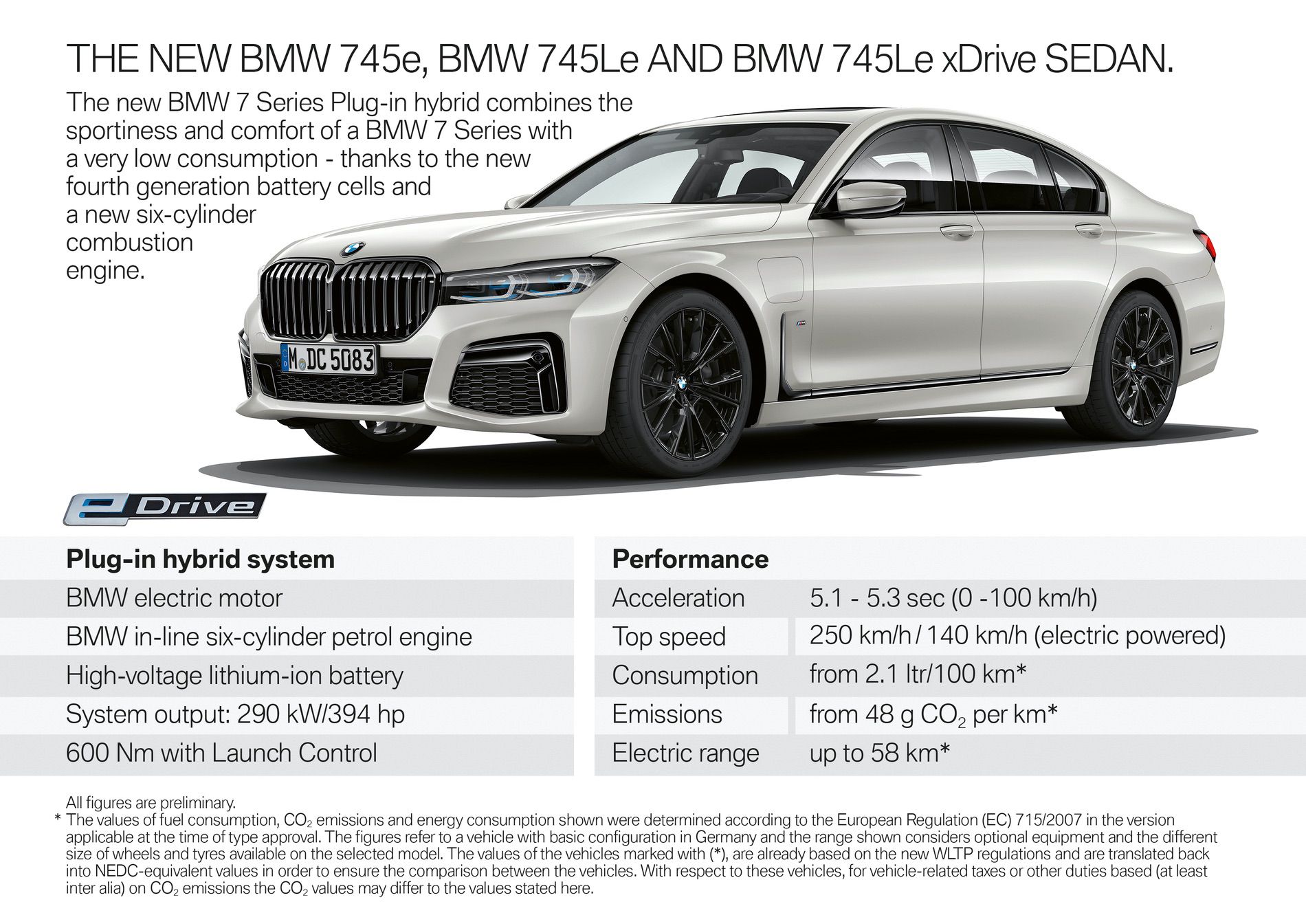 The new BMW 745e accelerates in 5.2 seconds from zero to 100 km/h, while the new BMW 745Le takes 5.3 seconds. Meanwhile the new BMW 745Le xDrive reaches the 100 km/h mark from standing in 5.1 seconds. The maximum speed for all three models is electronically cut off at 250 km/h.