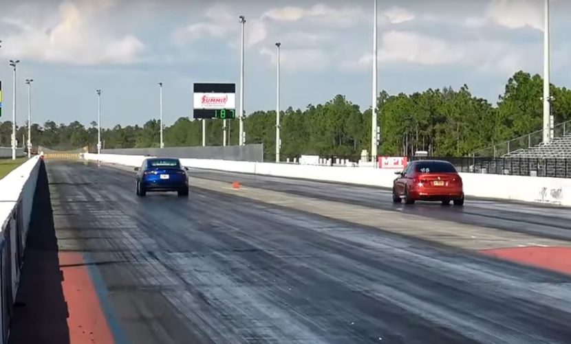 On the other side of the drag strip sits a rather unusual appearance for the decor. The Tesla Model 3 is not a dragster but people have gotten used to seeing Teslas in such an environment due to their amazing acceleration figures off the line. The Model 3 is the slowest of the range though. The electric motors make 450 HP and 471 lb-ft of torque, less than on the M5. However, the Model 3 does have all-wheel drive and is lighter than the M5 by some 300 lbs.