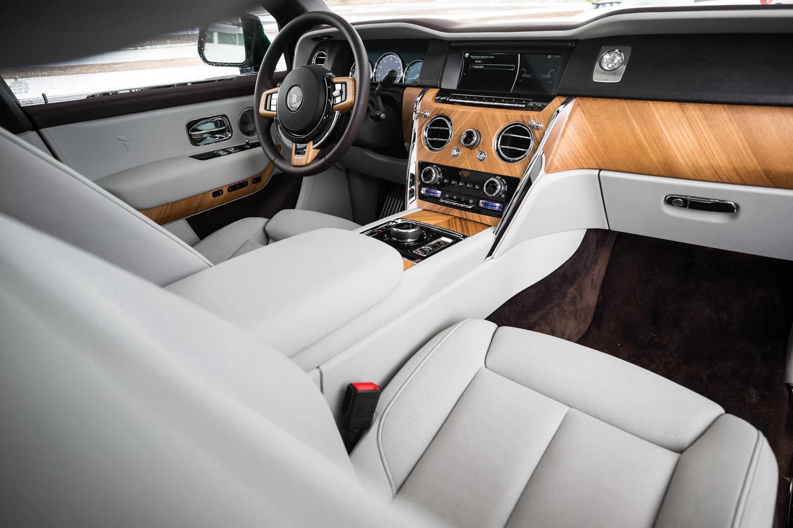Not only is it expertly crafted and wonderfully luxurious but it’s packed with technology, just tech that hides under the surface. For instance, the BMW-sourced iDrive (with Rolls Royce’s own graphics and user interface) can be hidden away with a bit of trim that cleans up the dashboard’s look. Also, front seat-backs have some lovely wood trim on them for the rear passengers, with two aluminum buttons that flank either side. Those buttons pop that piece of wood trim down, which becomes a tray table with a screen behind it which flips out. The screen is touch-sensitive and controls most of the features throughout the cabin. So while there’s a ton of tech, it can all be hidden away for some old-school luxury.