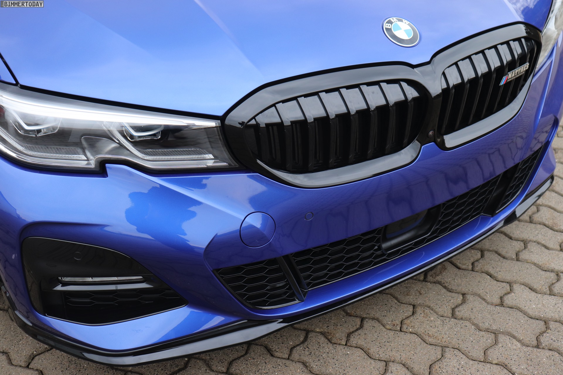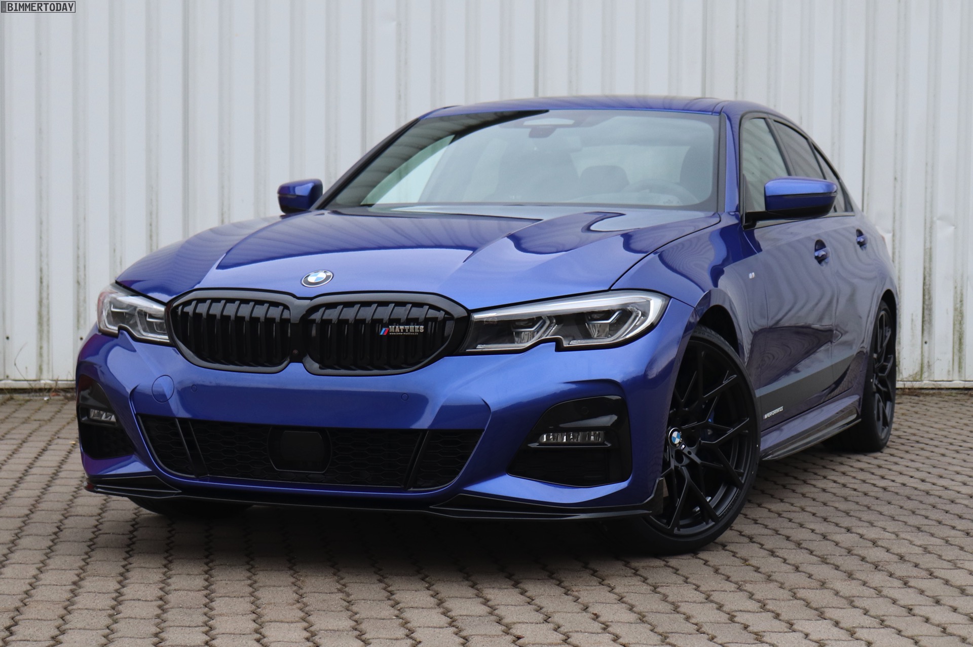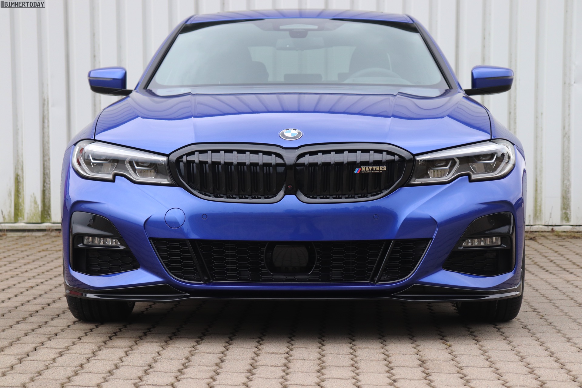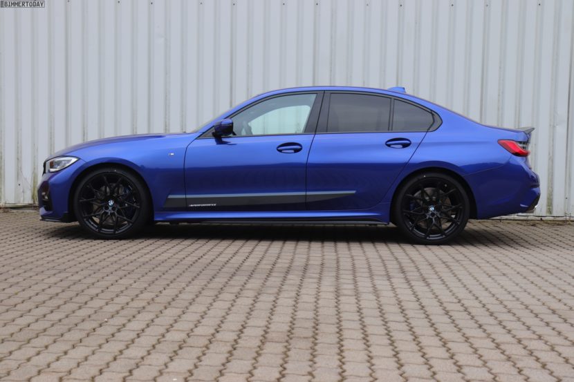 The BMW 3 Series G20 displayed here was configured by the Matthes Group car dealership in Germany and shows that the dark accents look very sporty even with a blue paint. The basis for the tuning appearance is the 330i equipped with the already aggressive M Sport Package and the Extended Shadow Line option which already includes some black accents.