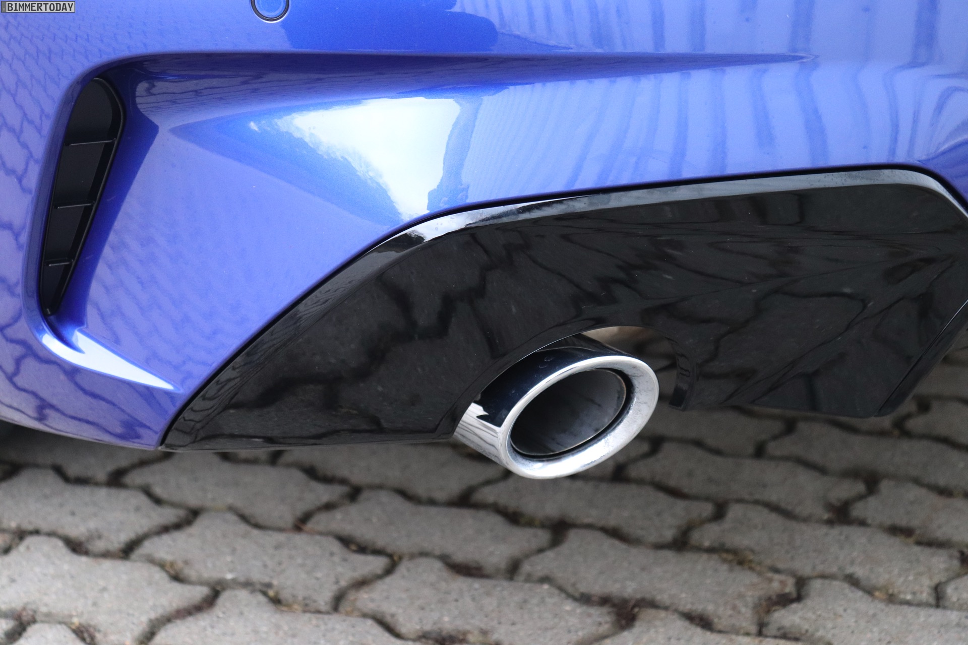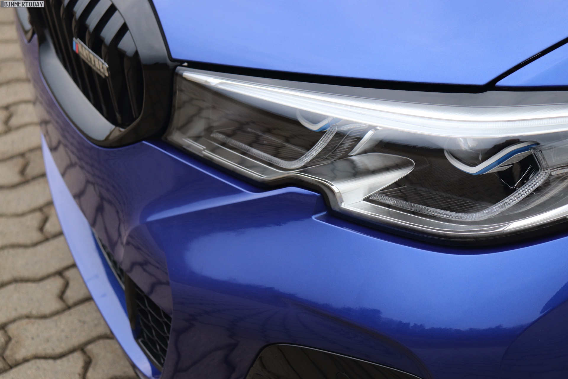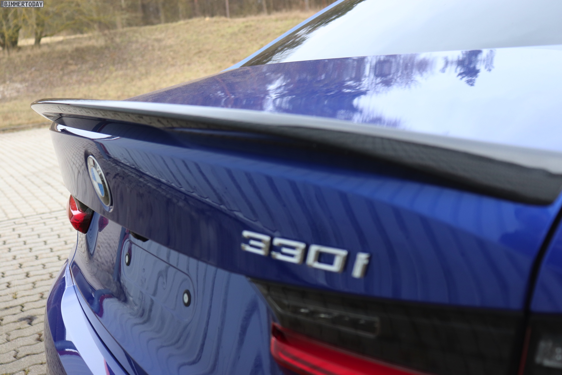 The BMW 3 Series G20 displayed here was configured by the Matthes Group car dealership in Germany and shows that the dark accents look very sporty even with a blue paint. The basis for the tuning appearance is the 330i equipped with the already aggressive M Sport Package and the Extended Shadow Line option which already includes some black accents.