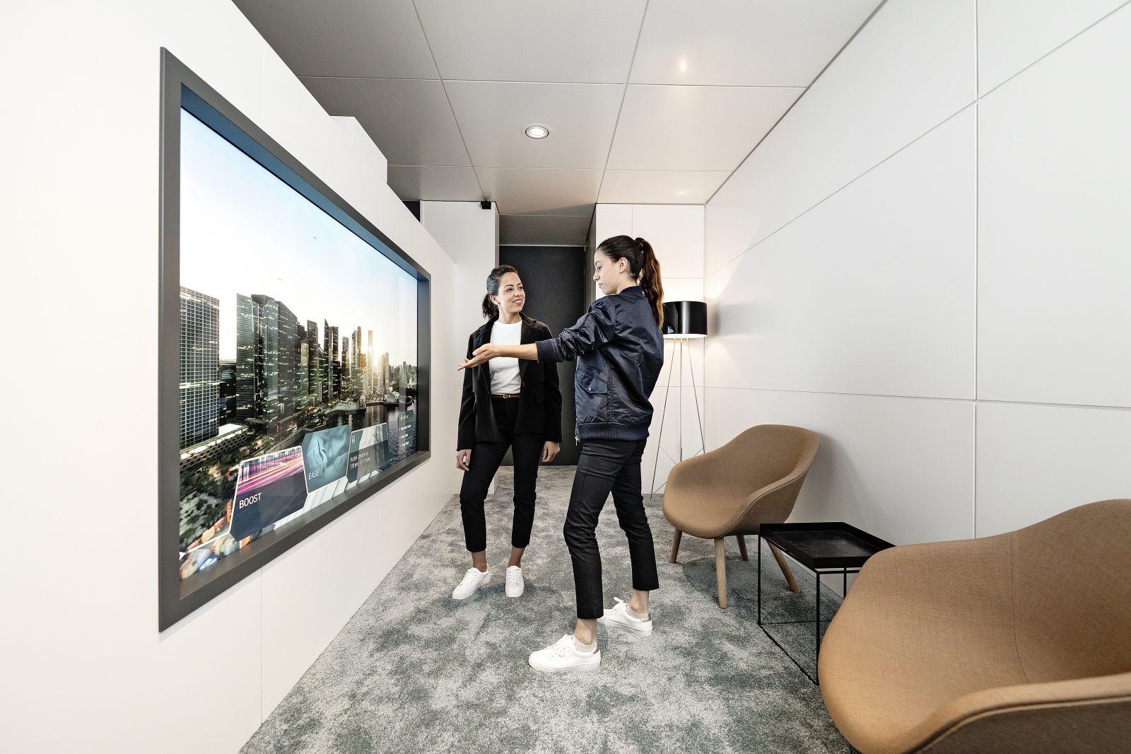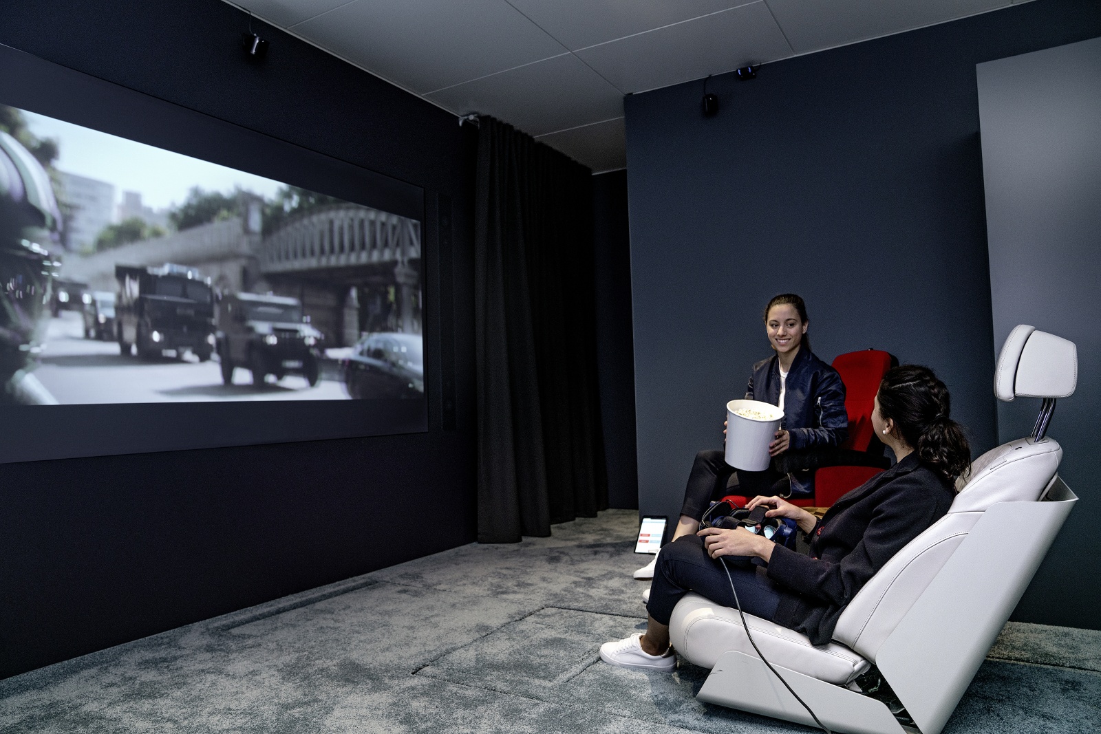 Visitors discover the previously unknown freedom of gesture control throughout the area detected by the gesture camera, which extends across the entire width of the front vehicle interior. Initially, in training mode, directional detection of the pointing gesture is visualised by a dynamic light pulse that follows the direction. Objects the driver can interact with via pointing are then highlighted. Just how natural this interaction is becomes apparent in the simple combination of gesture and language. For example, if the driver points to a side window, this is visually highlighted with a frame and the voice command “Open” will then open the chosen window. These totally new possibilities for interaction with the immediate environment are revealed during an automated journey through a futuristic city the driver is unfamiliar with. The vehicle takes over driving and the visitor embarks on a sightseeing tour of a very different kind – simply pointing at buildings to obtain all the information they need about events and exhibitions. Towards the end of the ride, the user reserves tickets for a cinema they drive by along their route and streams the trailer for the film directly into the vehicle.