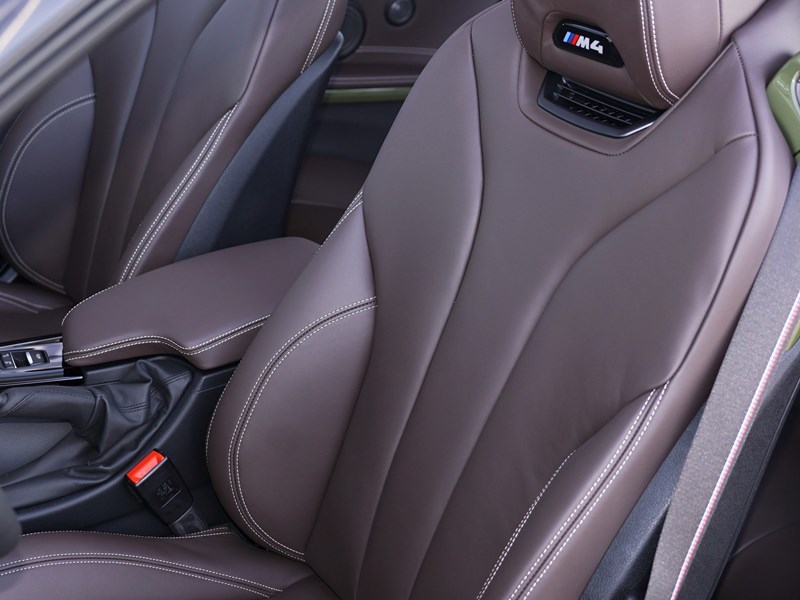 In the case of the BMW M4 F83 LCI shown, the green touch is not limited to the exterior, there are also some individual accents in Urban Green in the interior. In addition to the extended Merino leather interior in Cohiba Brown and the interior trim in Piano Black Black, the Individual M4 features accent stripes in the exterior color around the dashboard, doors and steering wheel.
