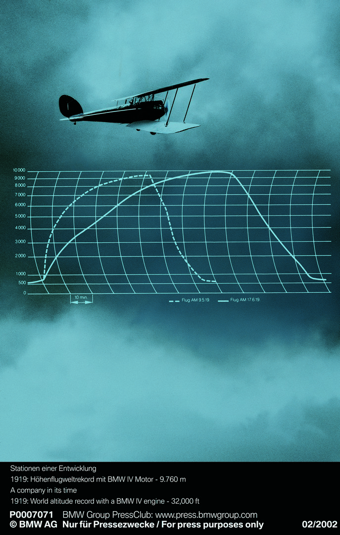 On 17 June 1919, the experienced test pilot Franz Zeno Diemer set out to help the fledgling company BMW achieve a first world record. He took off from Munich’s Oberwiesenfeld airfield piloting his aeroplane manufactured by Deutsche Flugzeugwerke and powered by the BMW IV aero-engine on the route to a sensational record attempt. The 230 hp engine was designed on the basis of a principle conceived especially for flying at great altitudes. Diemer took around one and a half hours to fly his machine up to an altitude of 9,760 metres. In the open cockpit, he had to contend with temperatures down to minus 50 degrees and breathe in air with gradually diminishing oxygen levels. Never before had an aircraft flown so high.