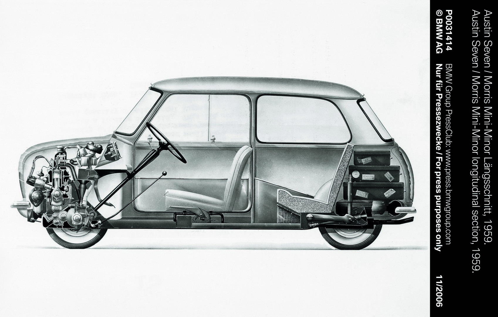 He sketched out the first design drafts on a napkin. The designer Alec Issigonis created a revolutionary small car on the basis of the resulting plans. On 4 April 1959, the first classic Mini rolled off the assembly line at the Austin Longbridge plant in Birmingham. In spite of an external length of 3.05 metres, the little car provided sufficient space for four occupants and their luggage. Issigonis applied a completely new design at the time, with front-wheel drive, a four-cylinder transverse engine mounted at the front of the car, and the gearbox configured beneath. This design layout was soon adopted by virtually all manufacturers in modified form. It offered the best prerequisites for the principle of creative use of space and for excitingly agile driving performance – attributes which characterise the models of the British premium brand to this day.