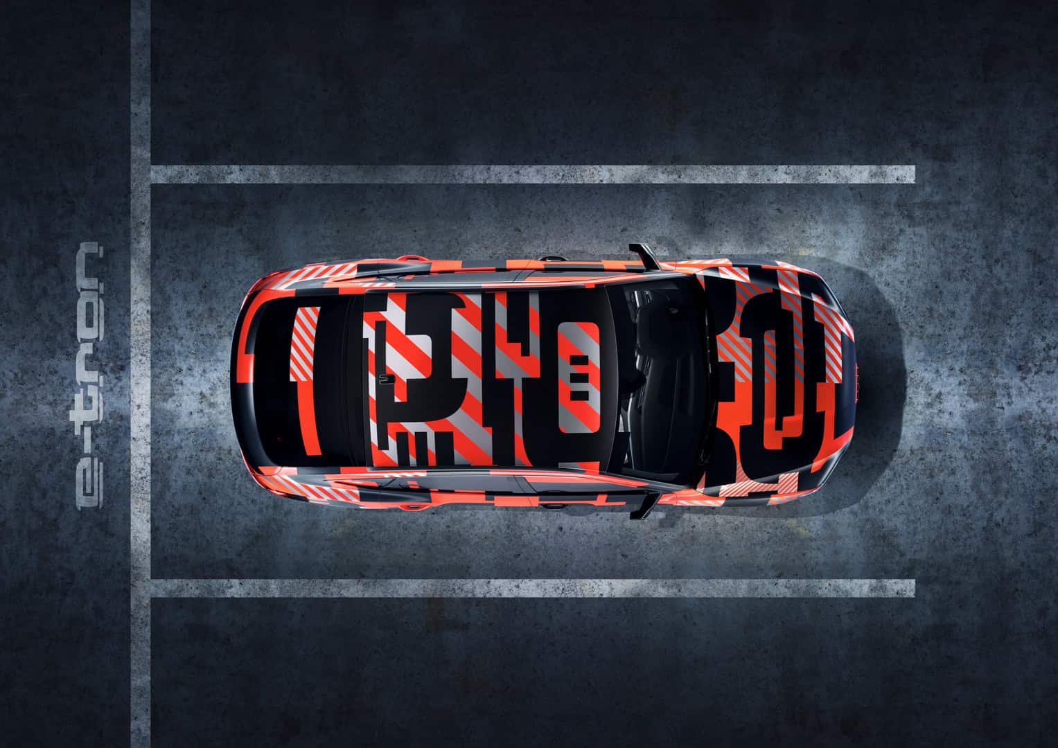 You can’t really see much through the factory camouflage but there are some really interesting design features here. For instance, it packs the same side mirror cameras as the bigger e-tron SUV (like them or not, they’re pretty fascinating), a subtle rear diffuser, and a small rear decklid lip spoiler. At least in its design, Audi seems to be suggesting this will be the sportiest of its electric SUVs. One little design touch I personally really like is the graphic on the tire sidewall, with the “e-tron” logo and the orange stripes. That would be cool on the production car, though doubtful.