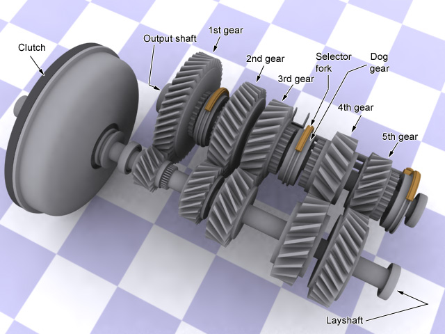 The single clutch and gear selector could be implemented differently. Let’s say that each gear has a clutch associated with it. You could then do away with the single clutch between engine and transmission as well as the gear selector. The default state is for the gear to be selected only when the clutch pedal is depressed (meaning you’d have to leave your foot on it). You would also need as many pedals as you have gears; definitely not practical.