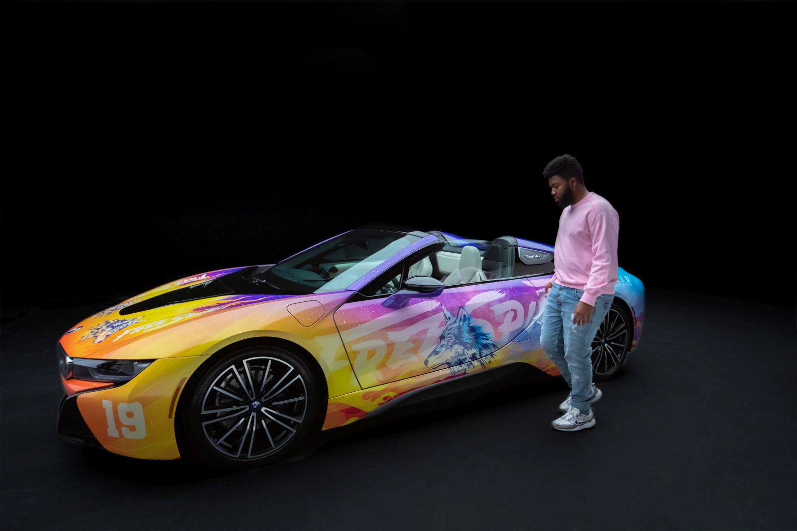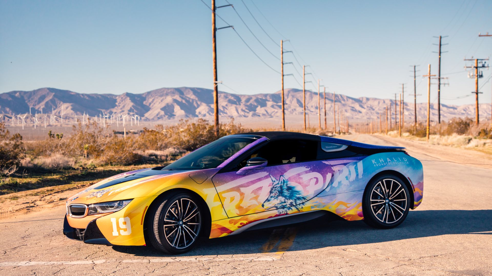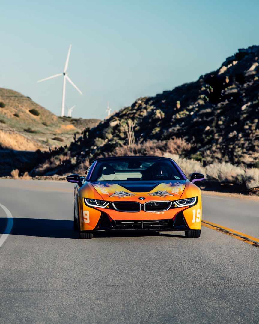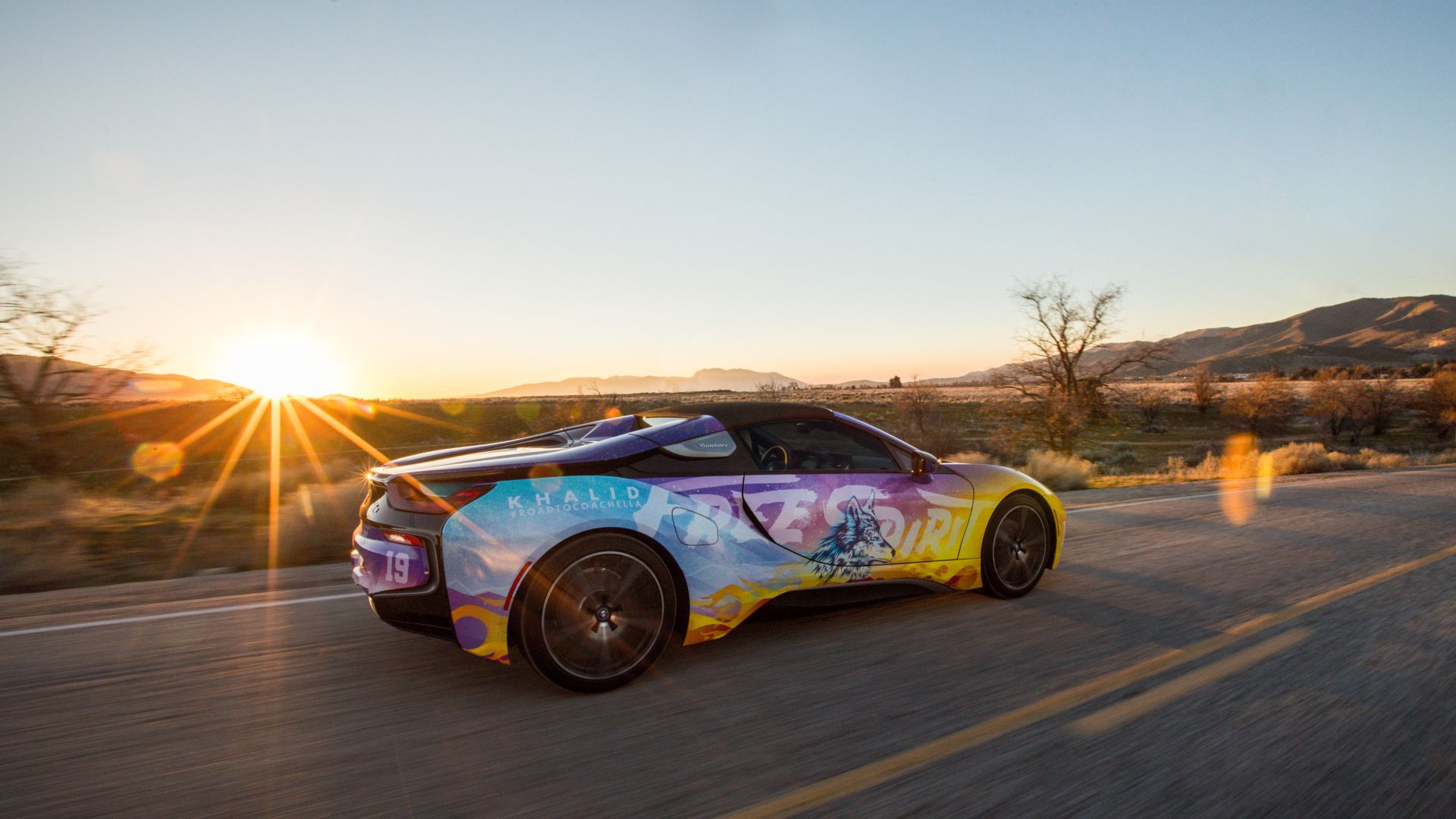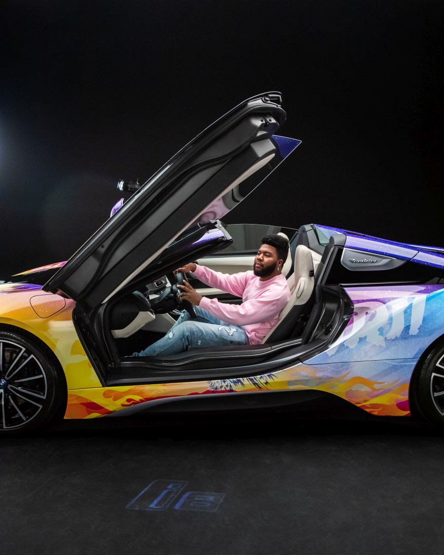 Although we saw a first video of the final creation a while back, the car wasn’t actually presented in detail until today. The photo gallery below contains all the details you want to know about. The striking look features flames and the image of a wolf and is inspired by the current album cover of Khalid. He inspired the festival fleet of vehicles for BMW i based on the cover of his new album ‘Free Spirit’. The Road to Coachella embodies the Free Spirit mentality of a fun road trip with friends to one of the greatest music festivals.