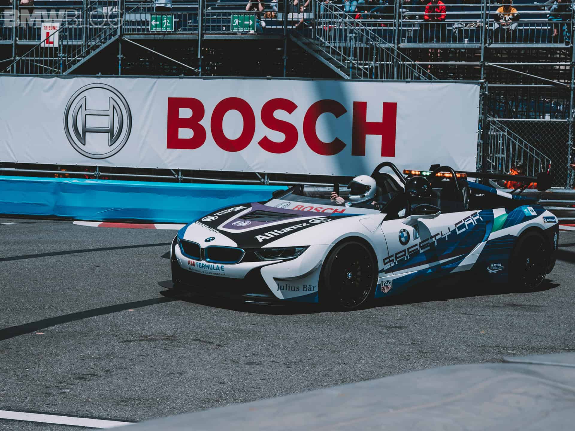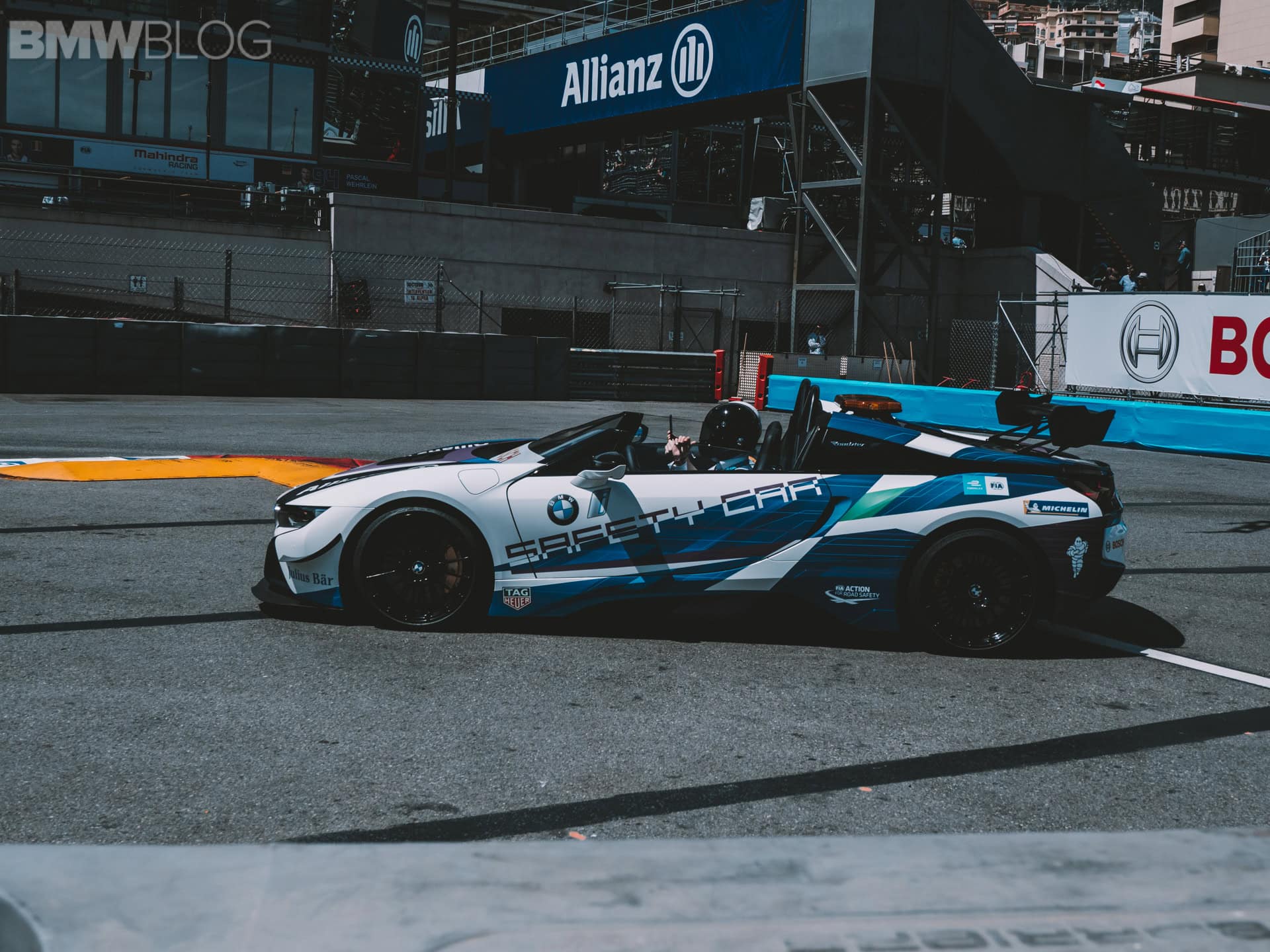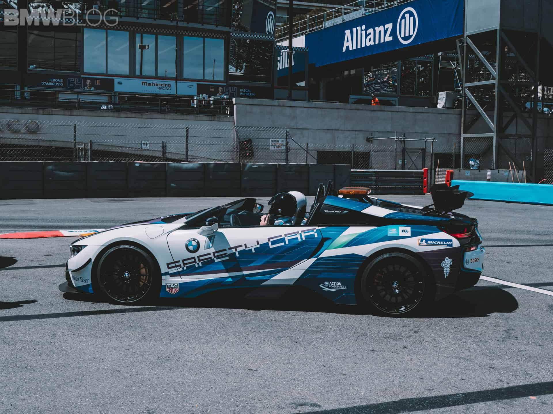 BMW says the i8 Roadster is the world’s first open-cockpit Safety Car. Other BMW models in the current Formula E championship include i3s as race director cars, and the medical car is a BMW 530e.
