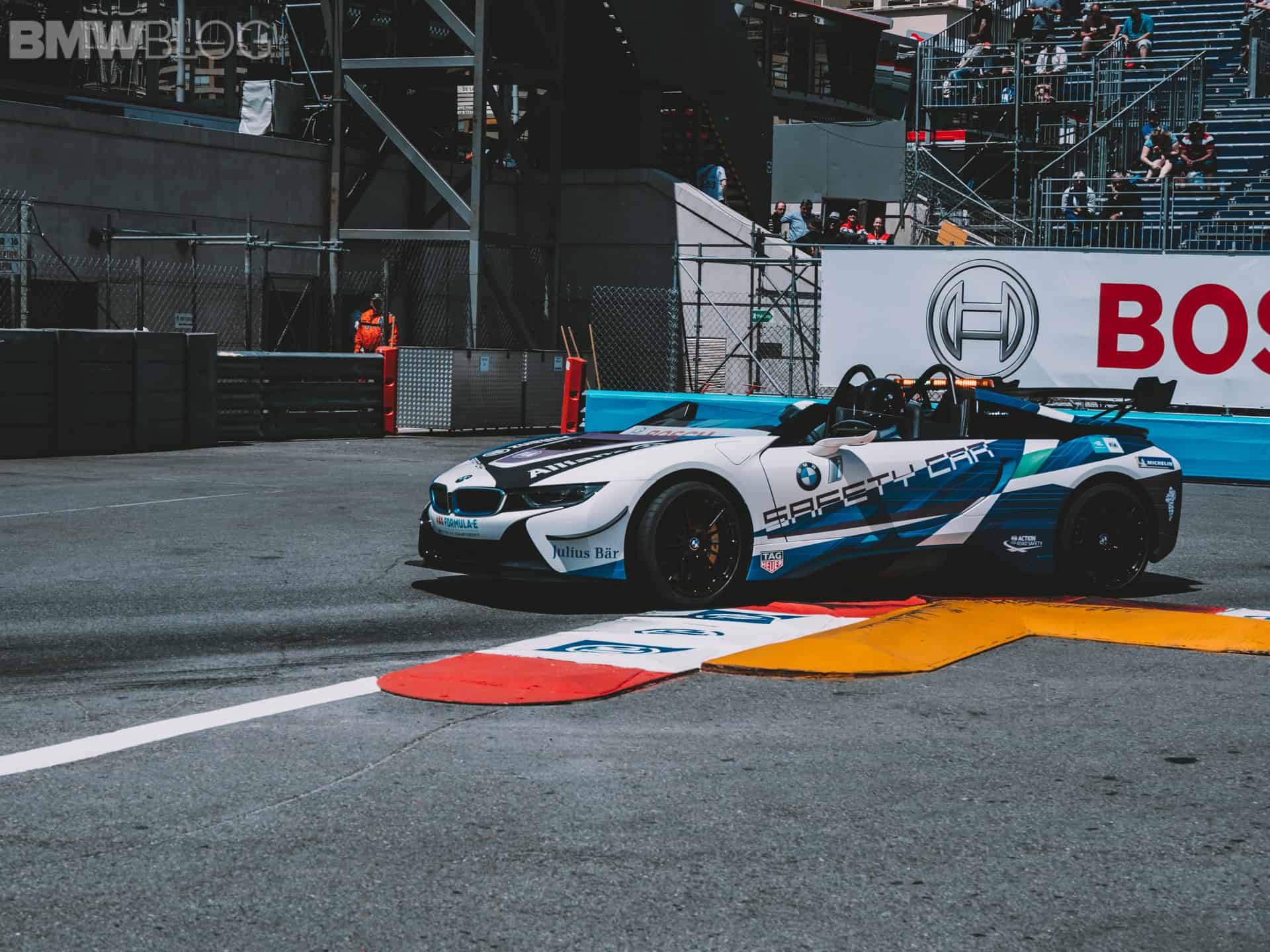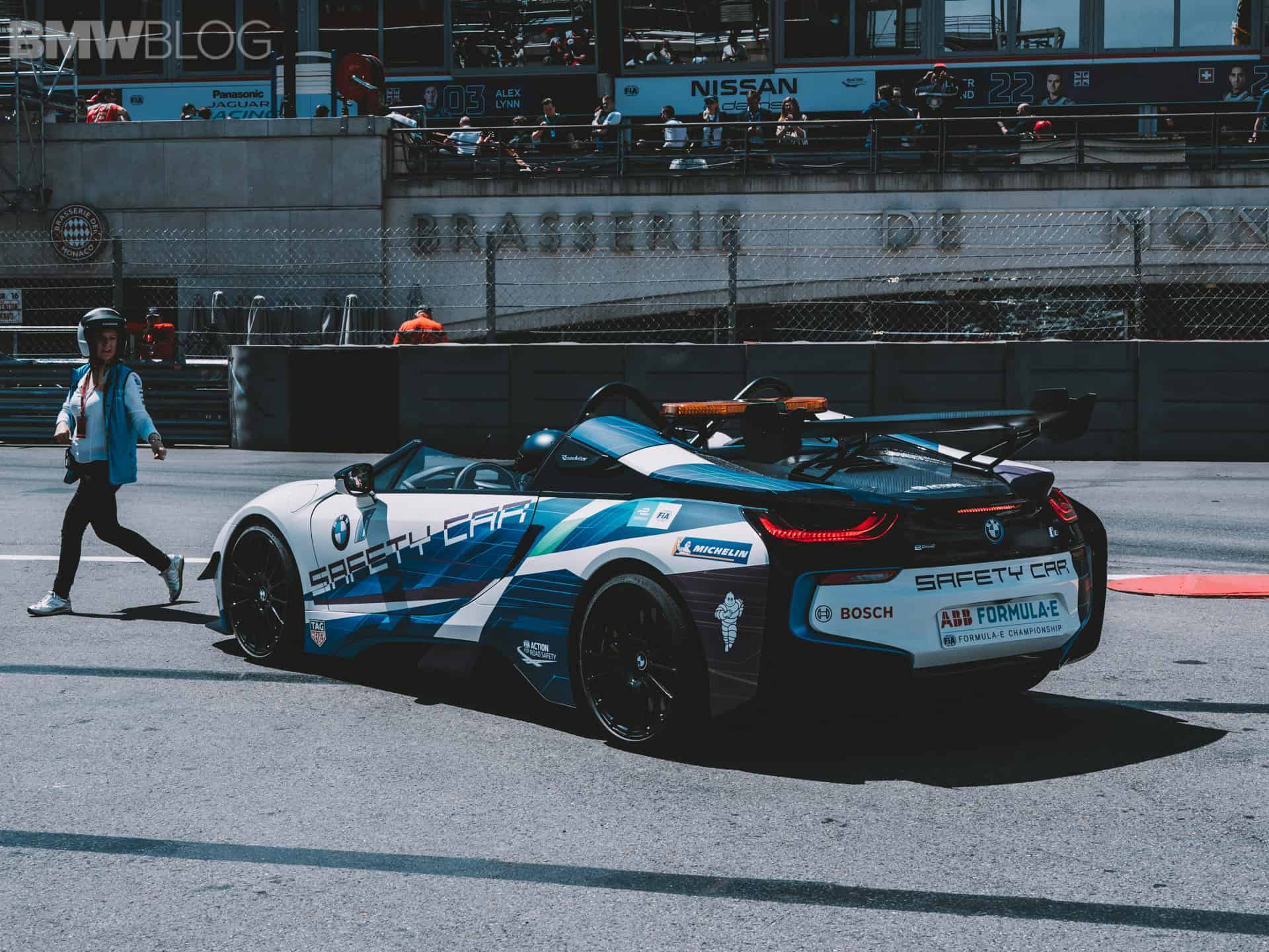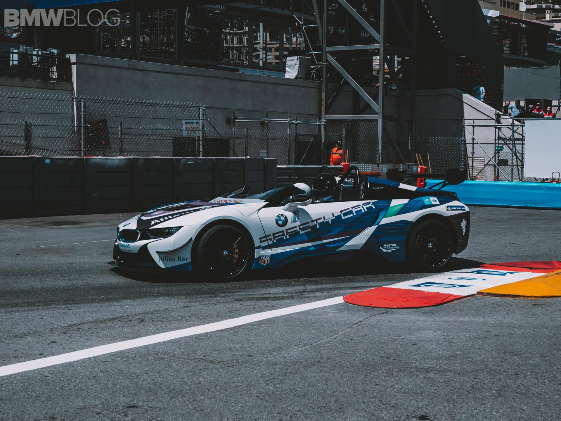 BMW says the i8 Roadster is the world’s first open-cockpit Safety Car. Other BMW models in the current Formula E championship include i3s as race director cars, and the medical car is a BMW 530e.