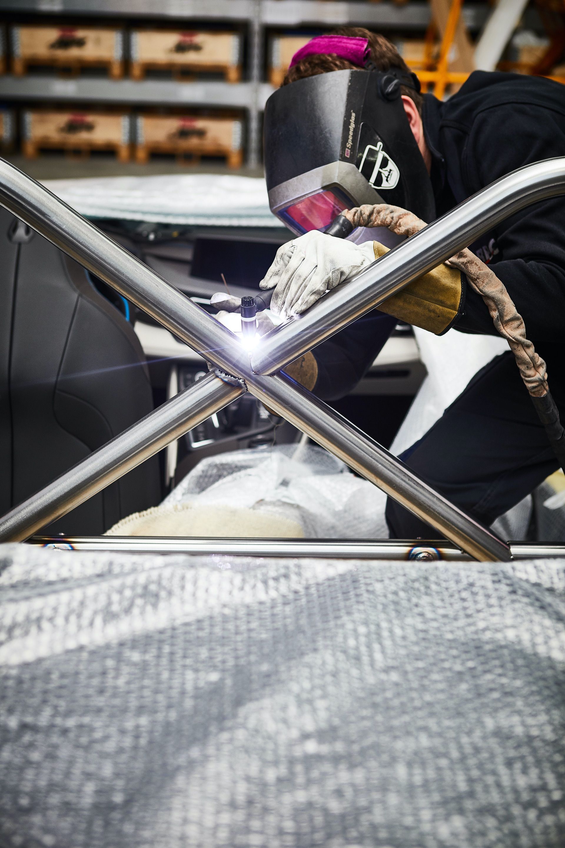 The focus was particularly on the rigidity of the body and the rollover protection. Because the windscreen has been extremely reduced and mounted between two shortened A-pillars, the driver must wear a helmet in any case. A FIA-certified roll bar protects occupants in the event of a rollover.
