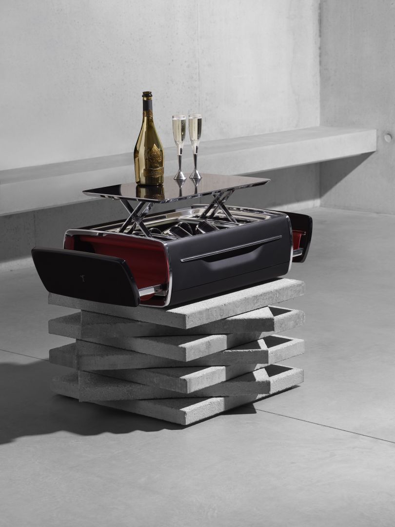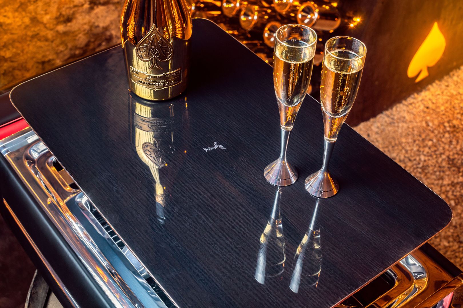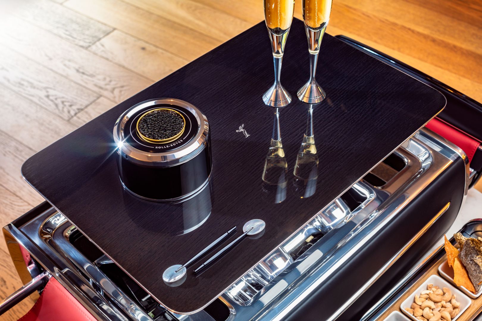 The chassis is made of machined aluminum and carbon fiber. Natural Grain black leather covers nearly all the rest of the chest and has the Spirit of Ecstasy embroidered on the sides. Tudor Oak wood completes the list of materials used. At the touch of a button the case opens to reveal the champagne set for four guests. The exterior lid metamorphoses into a serving tray made of Tudor Oak wood with a laser-cut stainless steel inlay. Four cotton napkins with embroidered ‘RR’ monograms are hidden under the lacquered Tudor Oak table.