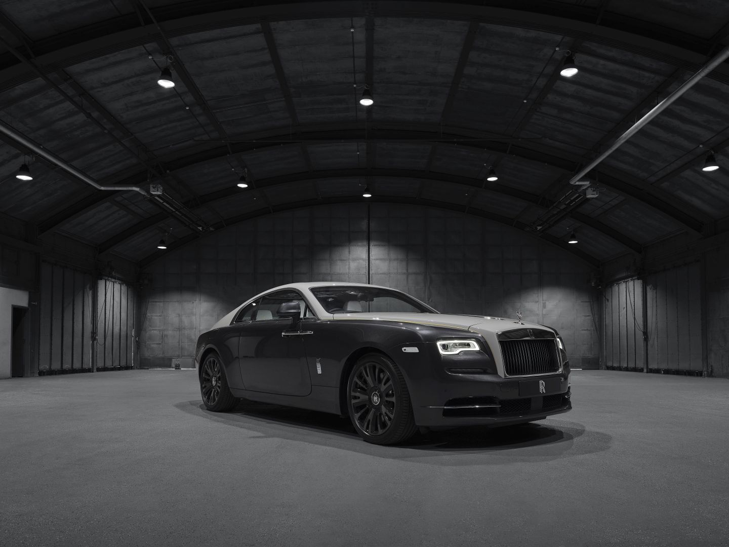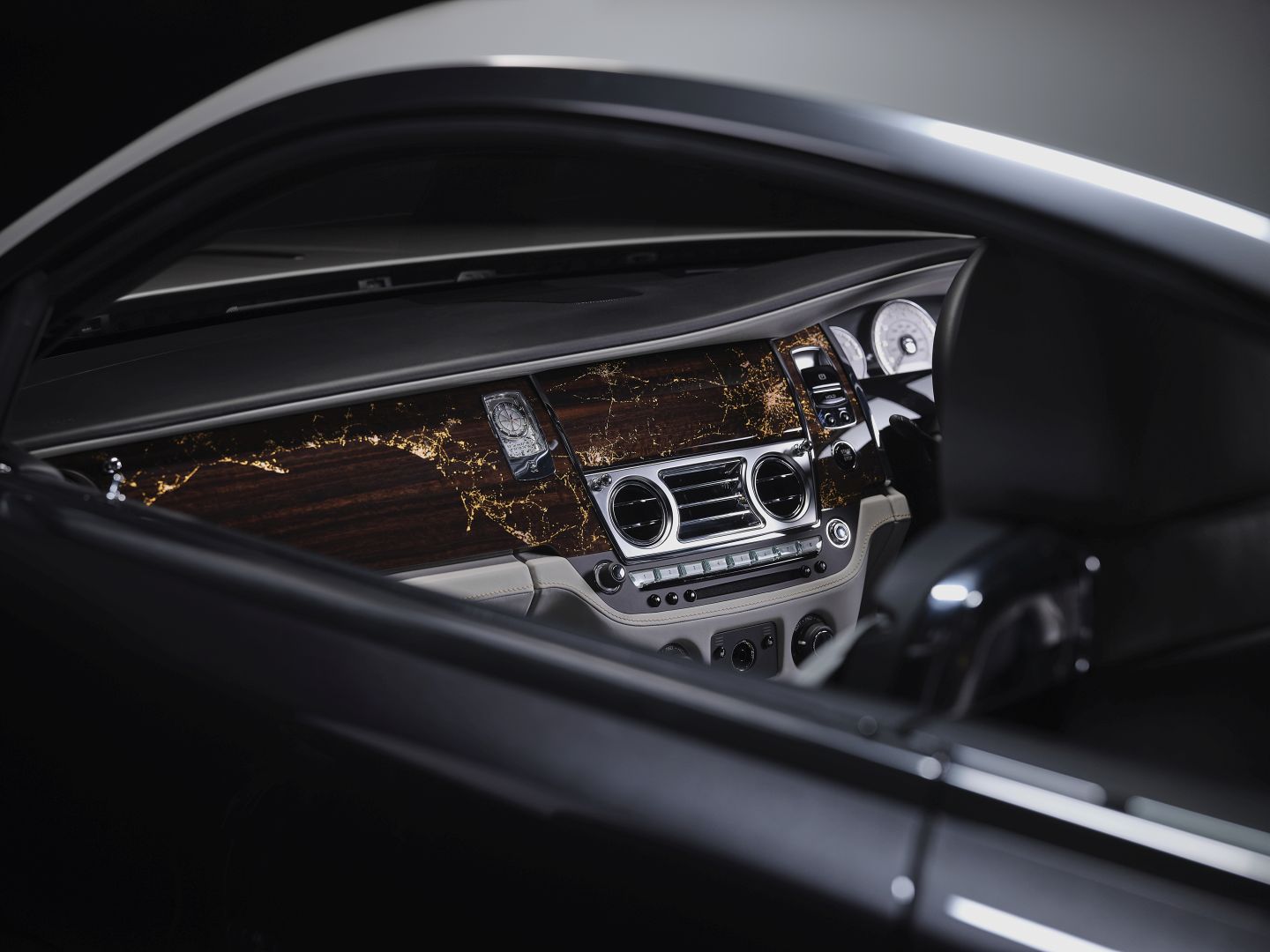 The exterior of the Wraith Eagle VIII Collection Car is evocative of Alcock and Brown’s night time adventure. Swathed in Gunmetal with a Selby Grey upper two-tone, the colors are separated by a brass feature line, a hint at the detailing that lies within. The black grille vanes draw immediate reference to the Rolls-Royce Eagle VIII engine cowling on the Vickers Vimy aircraft, the wheels are part polished with a translucent shadow finish.