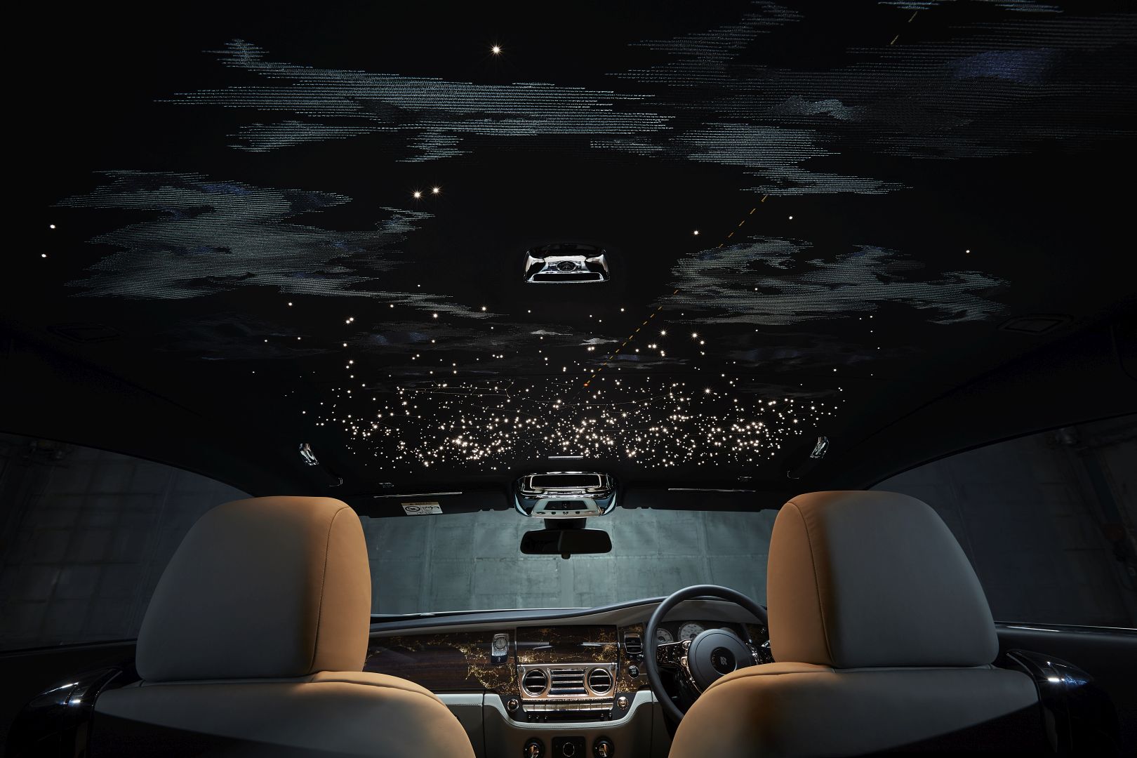 Perhaps the most alluring feature of the Collection is the unique starlight headliner. 1,183 starlight fibers show the celestial arrangement at the time of the flight in 1919, the flight path and constellations are embroidered in brass thread, whilst the exact moment the pair left the cloud to navigate by the stars is indicated by a red fiber optic light. Clouds are embroidered and a plaque reading, “The celestial arrangement at the halfway point 00:17am June 15th 1919, 50” 07’ Latitude North – 31” Longitude West” shows the half-way point of the momentous journey.