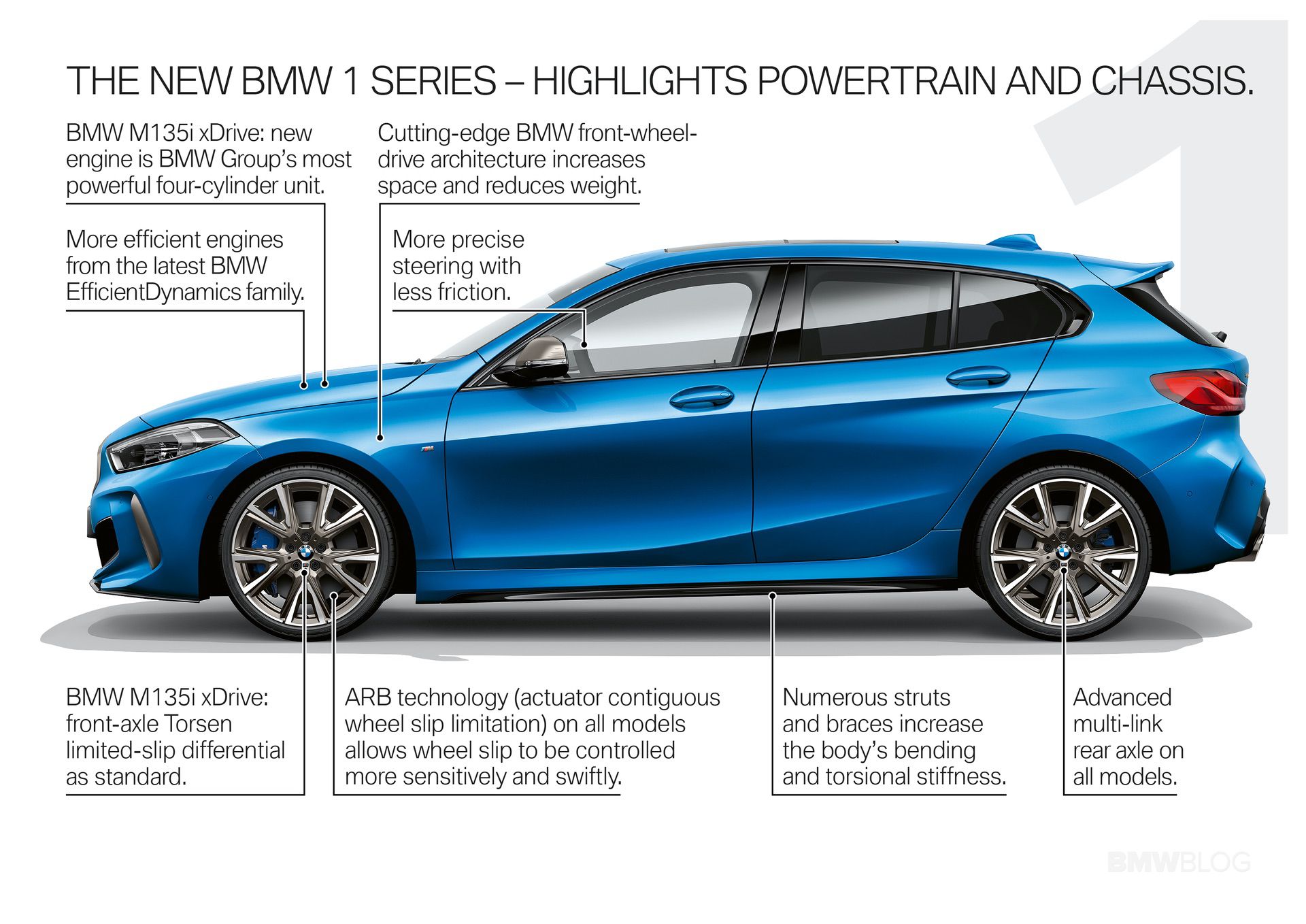 The top model is the M135i xDrive which uses the most powerful four-cylinder engine, extracting 225 kW (306 hp) from its 2.0-liter displacement between 5,000 and 6,250 rpm with the help of BMW TwinPower Turbo technology. Its peak torque of 450 Nm (332 lb-ft) comes on stream at 1,750 rpm and stays there up to 4,500 rpm. The flagship model races to 100 km/h (62 mph) from rest in just 4.8 seconds (4.7 seconds with M Performance package, available from 11/2019), while top speed is limited to 250 km/h (155 mph). Despite such breathtaking performance figures, the BMW M135i xDrive makes do with 7.1 – 6.8 liters of fuel per 100 kilometers (39.8 – 41.5 mpg imp) on the combined cycle and emits just 162 – 155 grams of CO2 per kilometer.