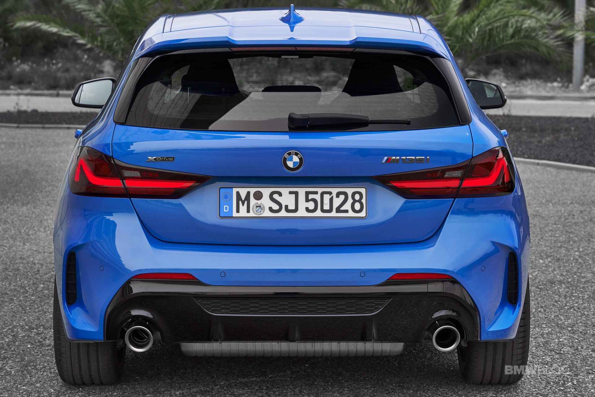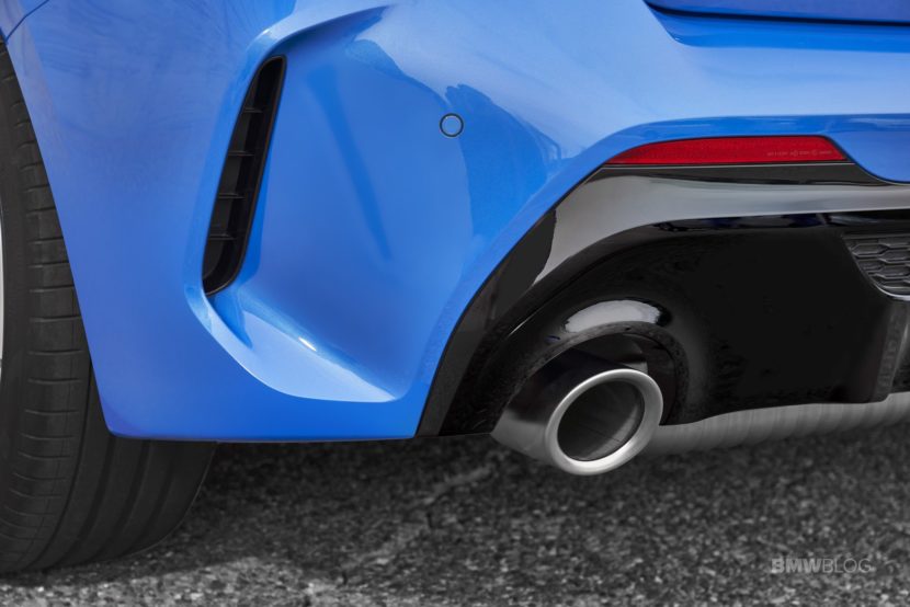 L-shapped taillights can be found in the back with full-LED lights as an option. Concealed under the red glass cover are the turn-signal indicator, brake and tail lights, reversing lights and rear foglamp. The basic version of the rear lights adopts a similar look using incandescent bulbs. The tailpipes are finished in chrome with a diameter of 90 millimeters (100 mm and angle-cut on the BMW M135i xDrive).