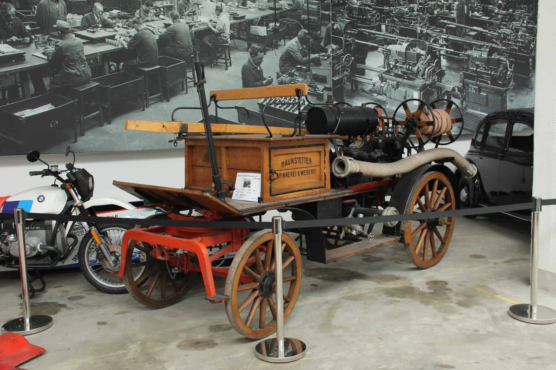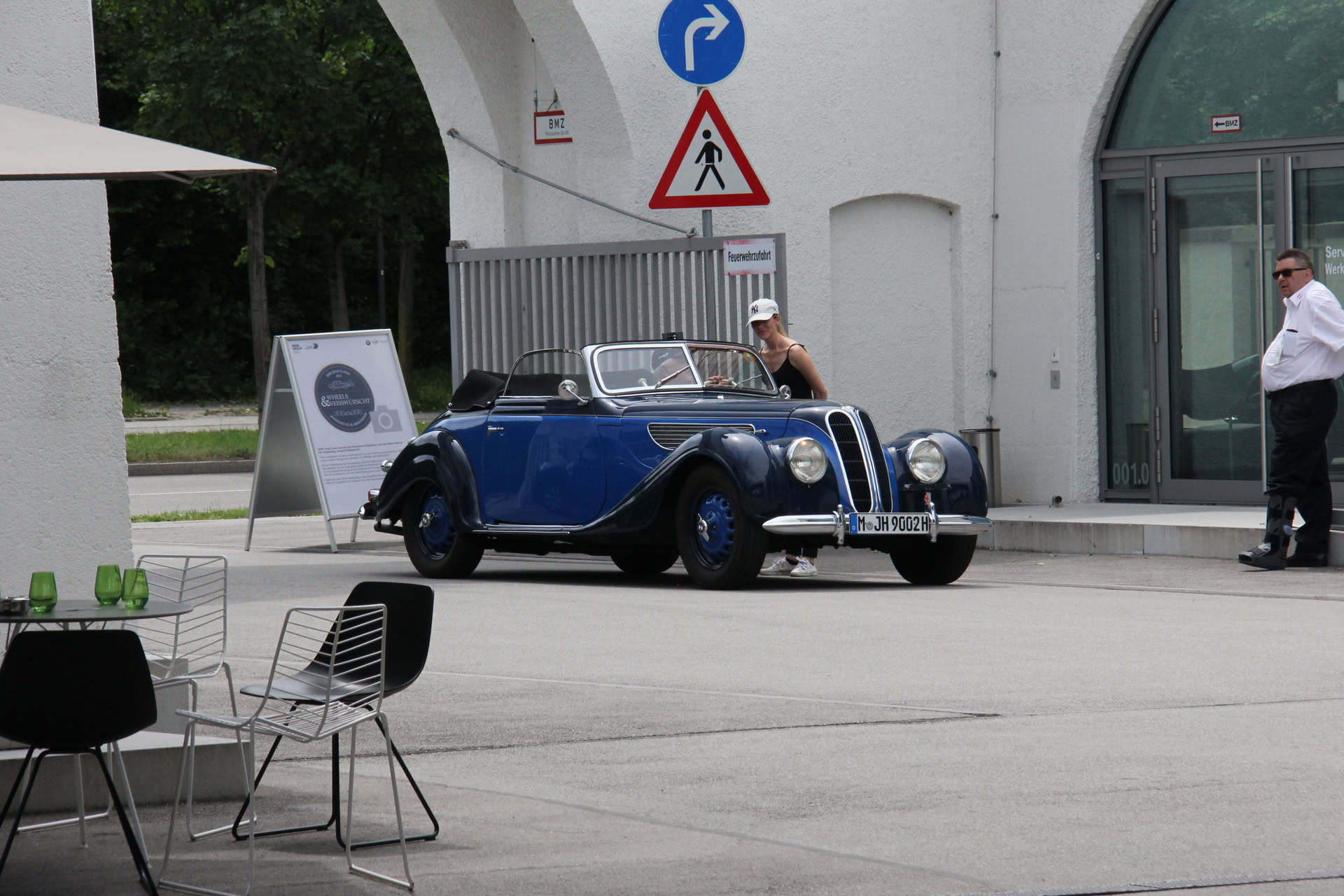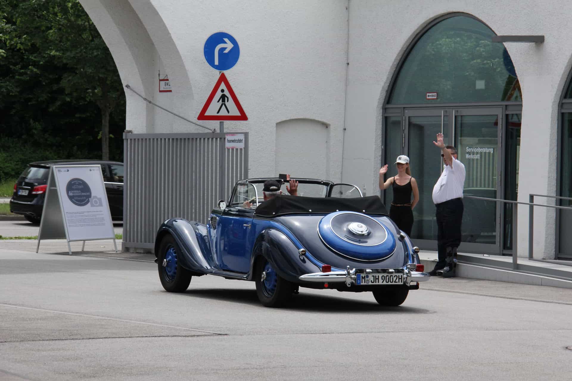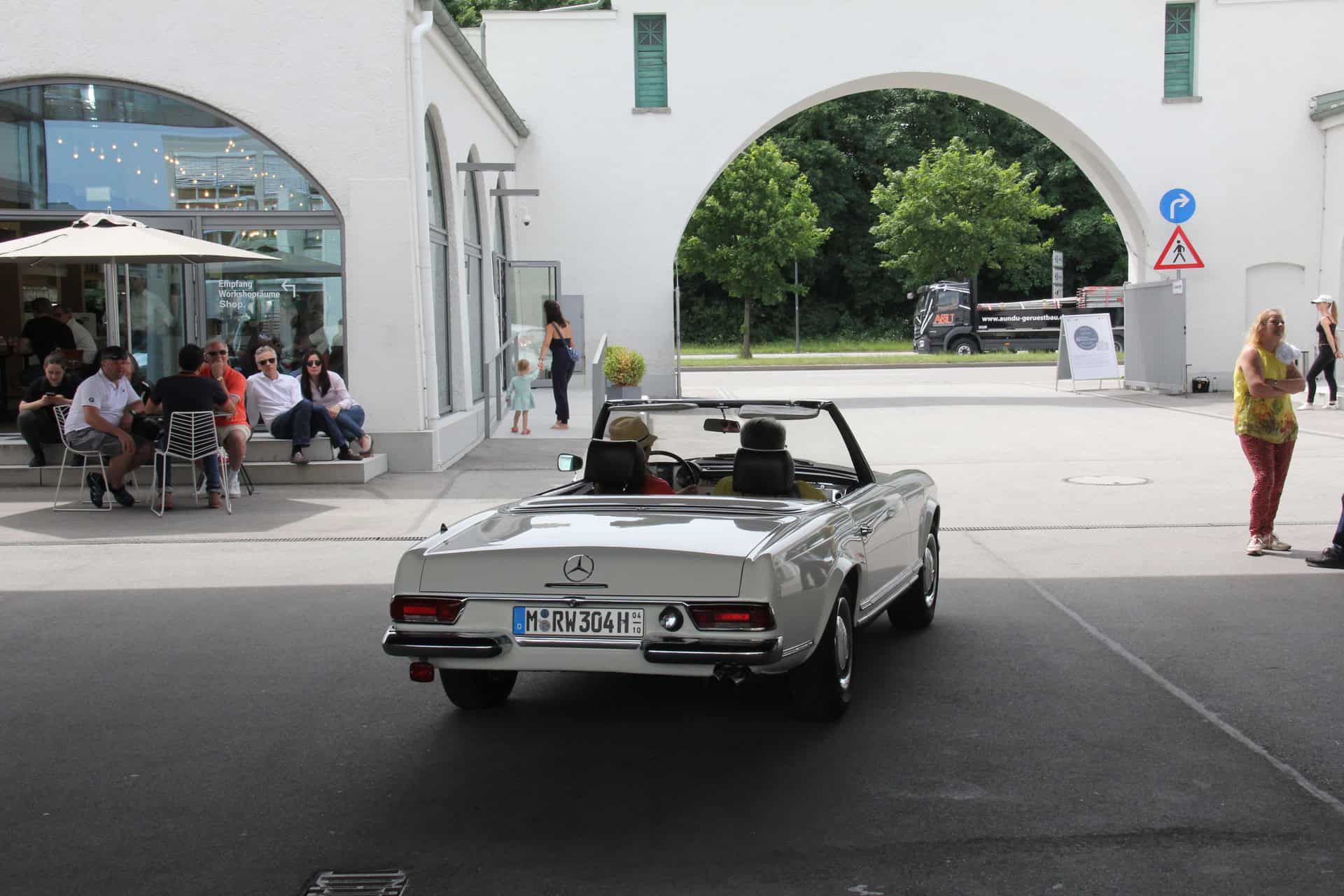 Each visitor who arrives at the gate entrance with a classic car or motorcycle receives a voucher for a traditional, Bavarian Weisswurscht and a fresh baked pretzel. The Weisswurscht is served in the modern Café “Mo 66” with a direct view onto the driveway and parking lot. Early birds might secure one out of six parking lots in front of the gate entrance. If you arrive a bit later, chances are high to get at least a parking lot in front of the transparent workshop.