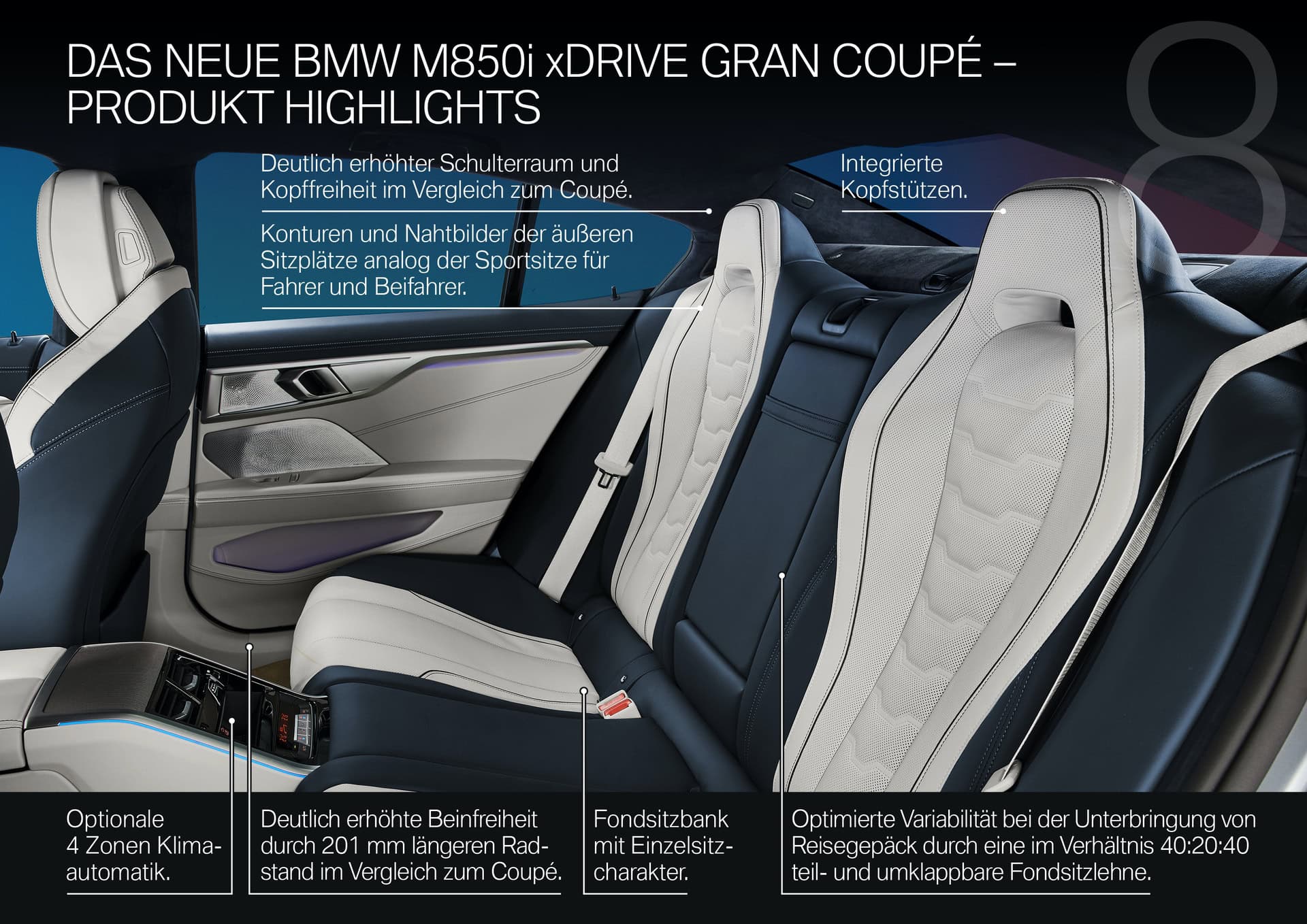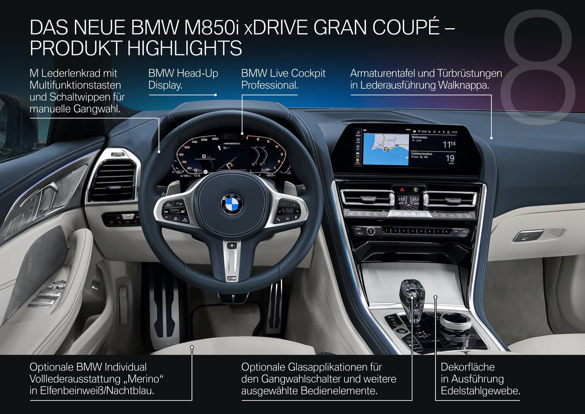 The 840i and 840i xDrive Gran Coupes feature standard Vernasca leather in either Black, Ivory White or Cognac. Optional on these two models and standard on the M850i xDrive Gran Coupe is Individual Extended Merino Leather in Black Ivory White, Cognac and two-tone Night Blue/Black, Tartufo/Black and Fiona Red/Black. BMW Individual Full Merino leather is optional on all three Gran Coupe models and includes Black, Cognac, Ivory White, Ivory White/Night Blue, Ivory White/Tartufo, Night Blue/Black, Tartufo/Black and Fiona Red/Black.