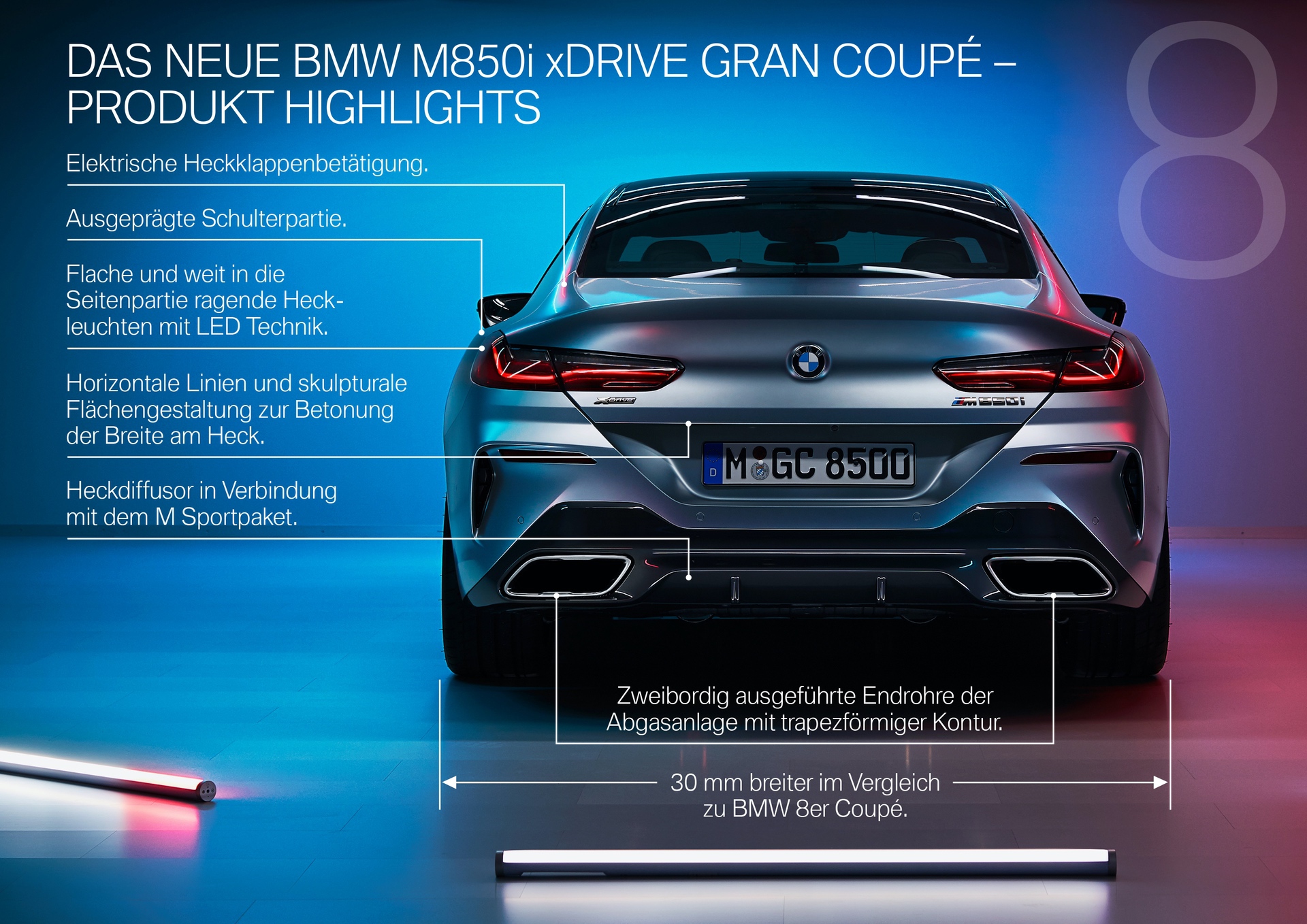 The new BMW 8 Series Gran Coupe will be launched with a choice of one non-metallic and six metallic exterior paint finishes. Carbon Black metallic and Barcelona Blue metallic will be offered as additional exterior colors for the BMW M850i xDrive Gran Coupe and in conjunction with the M Sport package. There will be a wide choice of BMW Individual paint finishes and BMW Individual special paint finishes available for the new BMW 8 Series Gran Coupe at launch or shortly afterwards. Customers can also take their pick from the BMW Individual matt paintwork variants in a silk matt finish and the particularly eye-catching Frozen Bluestone metallic finish.