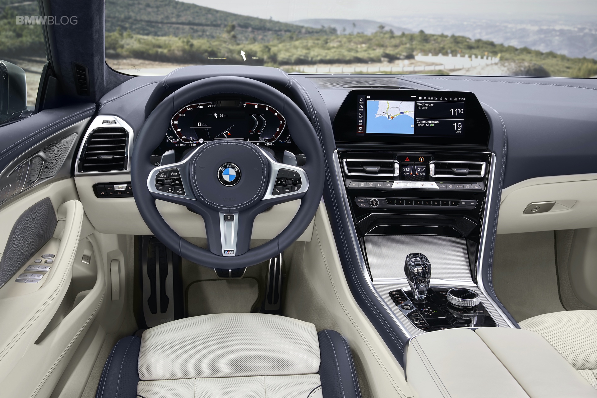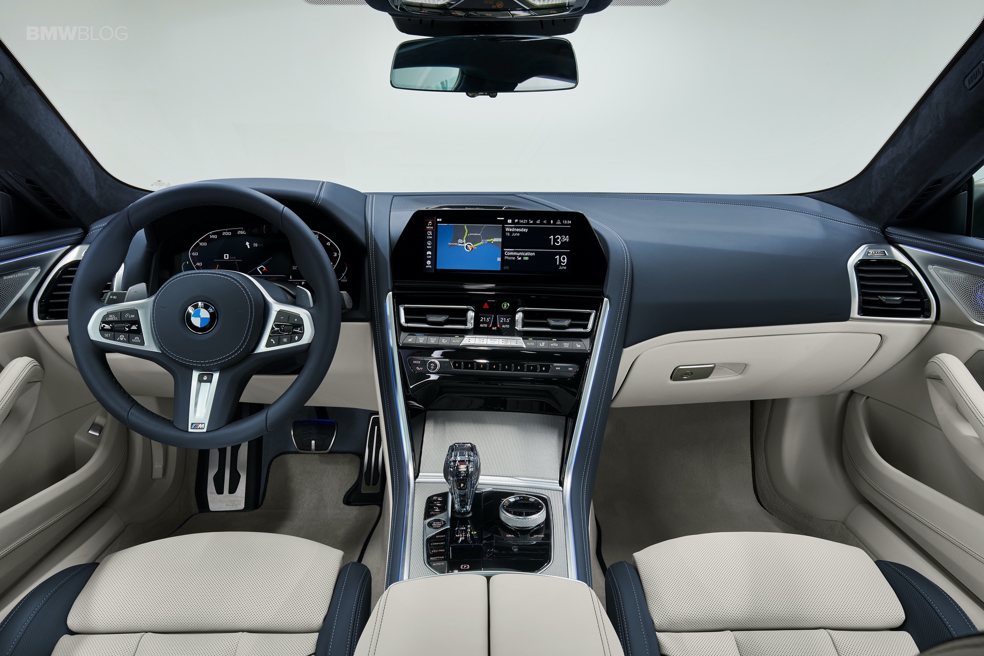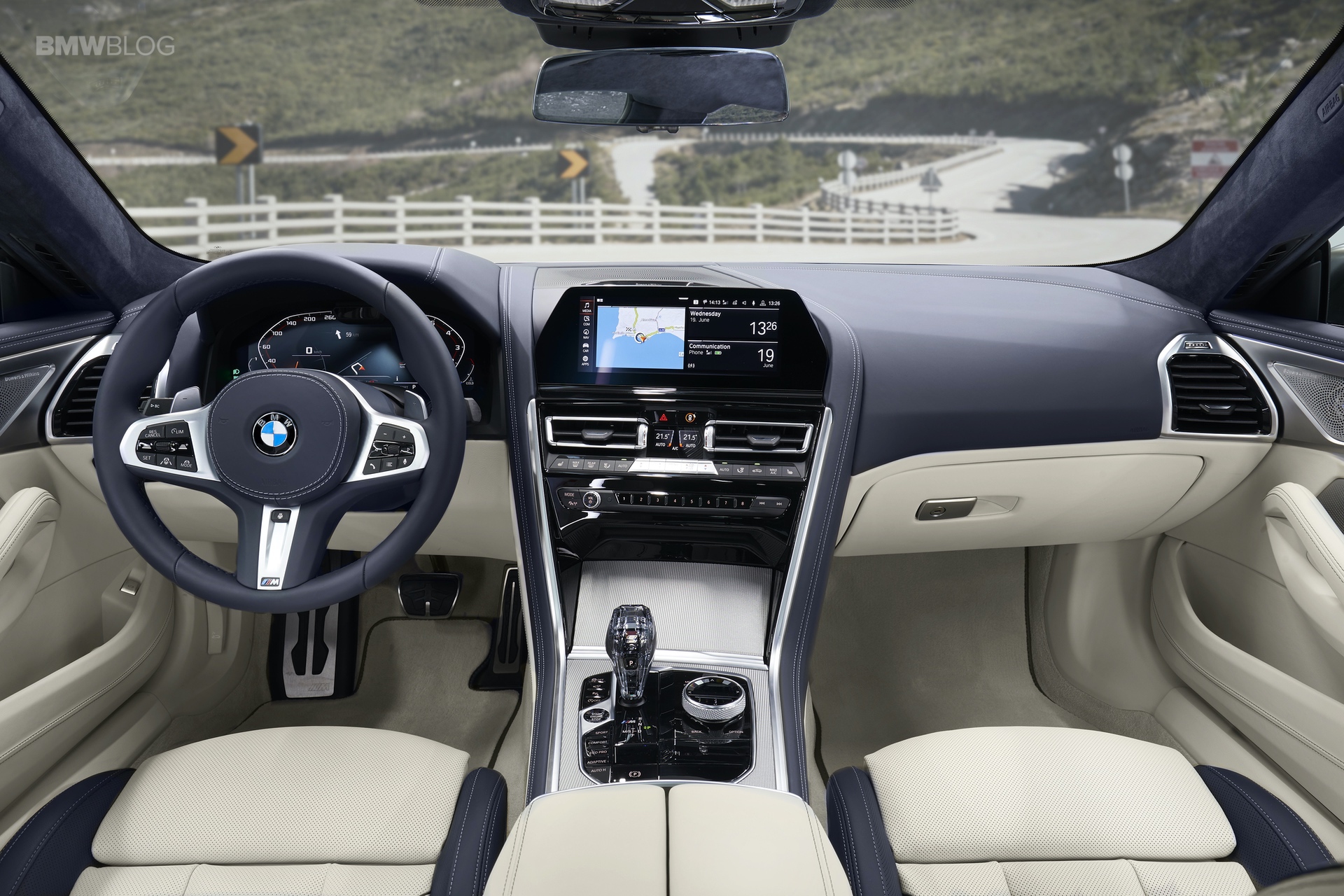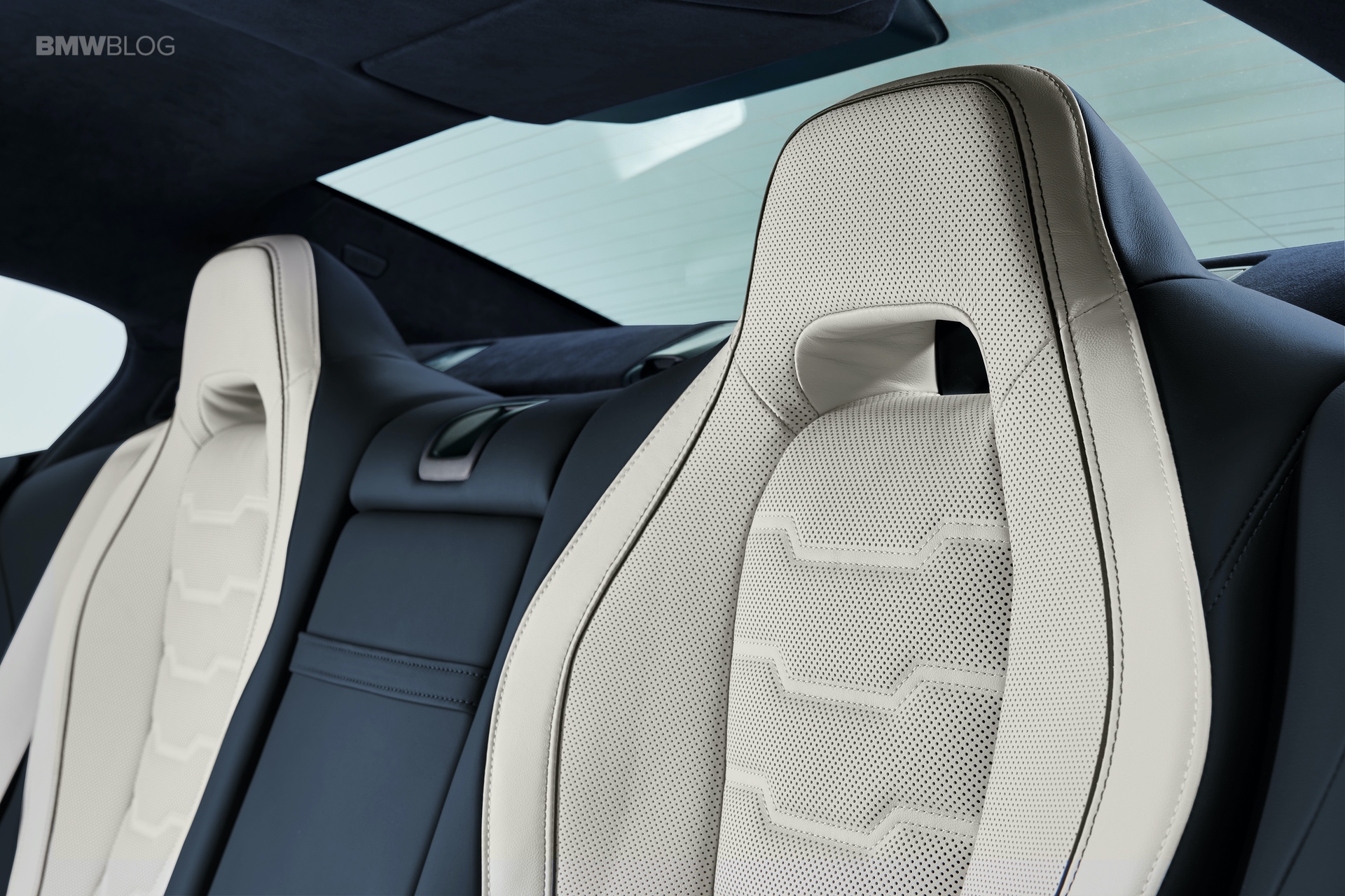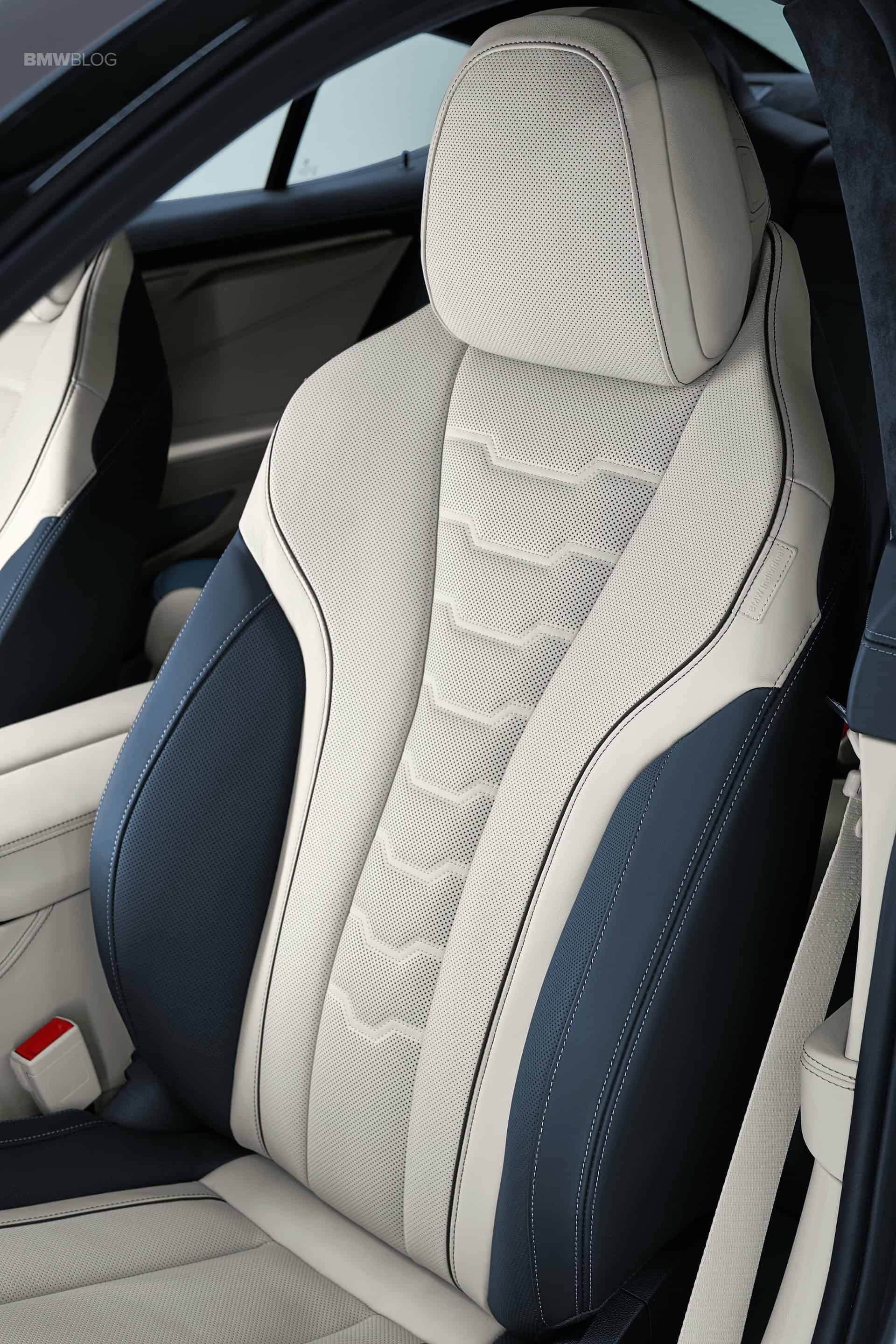 Inside, the BMW 8 Series Gran Coupe remains the same in the front seat (aside from the increase in headroom and slightly more upright view forward. However, it does get some new Individual interior options, one of which being the ivory white and blue option typically seen in the X7.