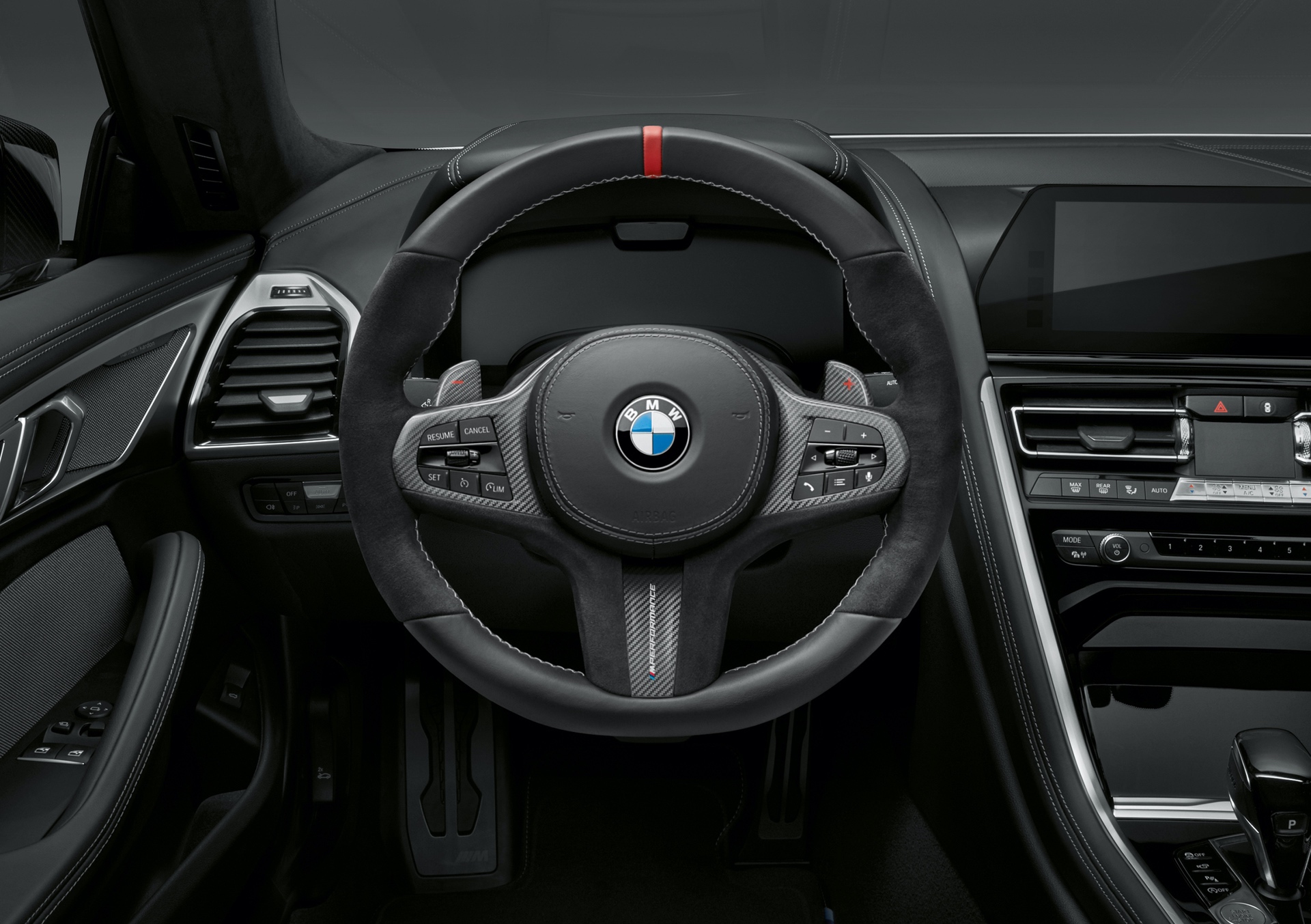 A wide range of M Performance components is available to choose from for the interior of the BMW 8 Series Gran Coupé as well. The M Performance steering wheel with extremely pronounced Alcantara grip area including thumb-rests and special underlay creates a pure race track feeling, for example.