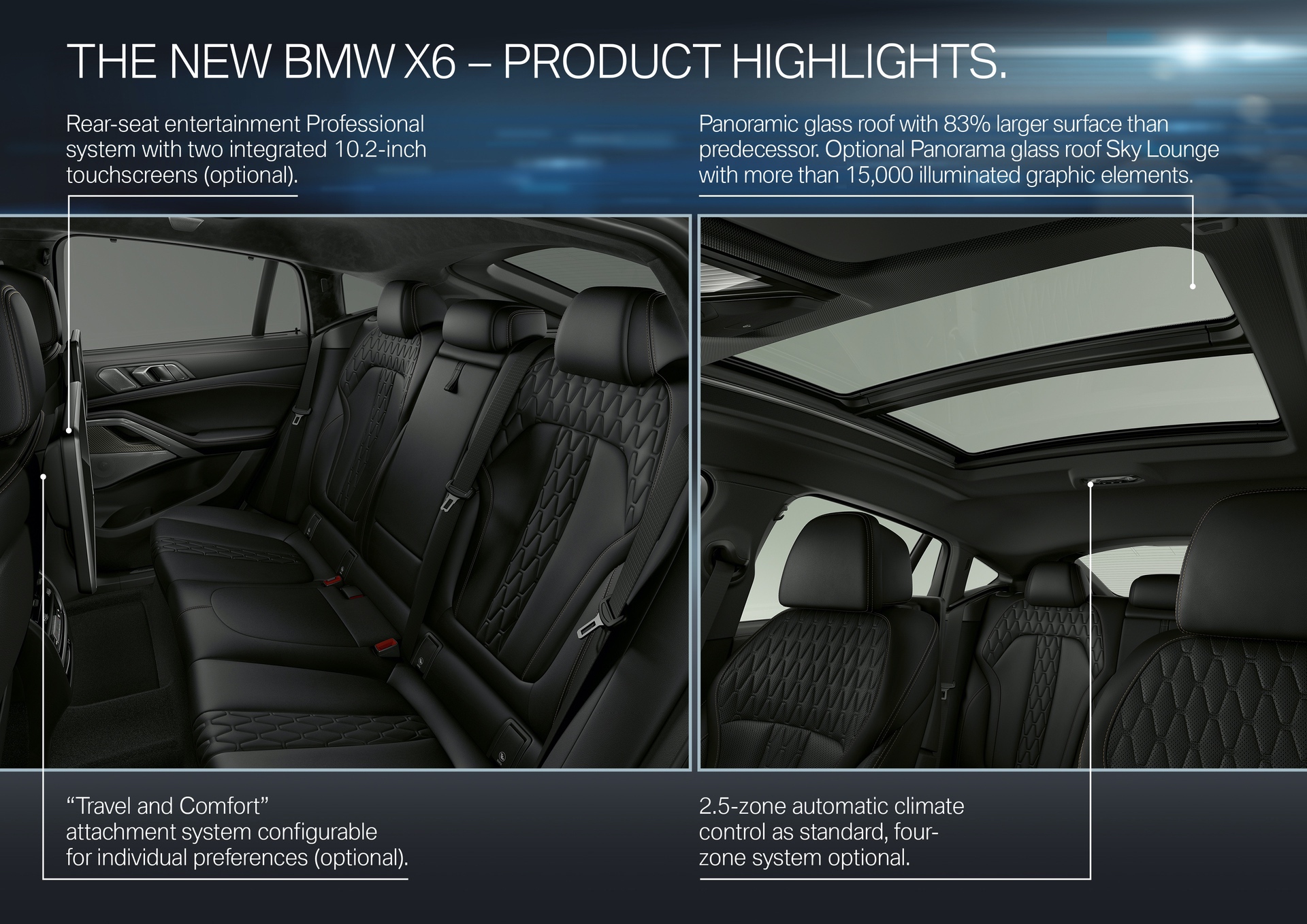 Just like the BMW X5, the X6 gets thermoelectric cupholders (that’s a fancy way for saying they’re heated and cooled), which are honestly brilliant. It also gets a Panoramic Glass Roof Sky Lounge, which features 15,000 illuminated patterns in the glass at night. There’s also the same glass effect options, on the shift lever, starter button and even the volume knob, as the X5, X7 and 8 Series.