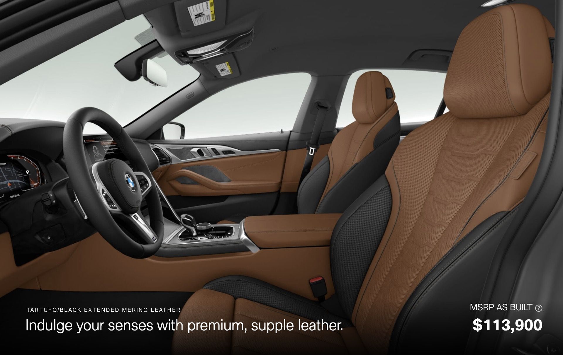 The leather options are also quite extensive with a choice of 15 different upholsteries. The 840i and 840i xDrive Gran Coupes feature standard Vernasca leather in either Black, Ivory White or Cognac. Optional on these two models and standard on the M850i xDrive Gran Coupe is Individual Extended Merino Leather in Black Ivory White, Cognac and two-tone Night Blue/Black, Tartufo/Black and Fiona Red/Black. BMW Individual Full Merino leather is optional on all three Gran Coupe models and includes Black, Cognac, Ivory White, Ivory White/Night Blue, Ivory White/Tartufo, Night Blue/Black, Tartufo/Black and Fiona Red/Black.