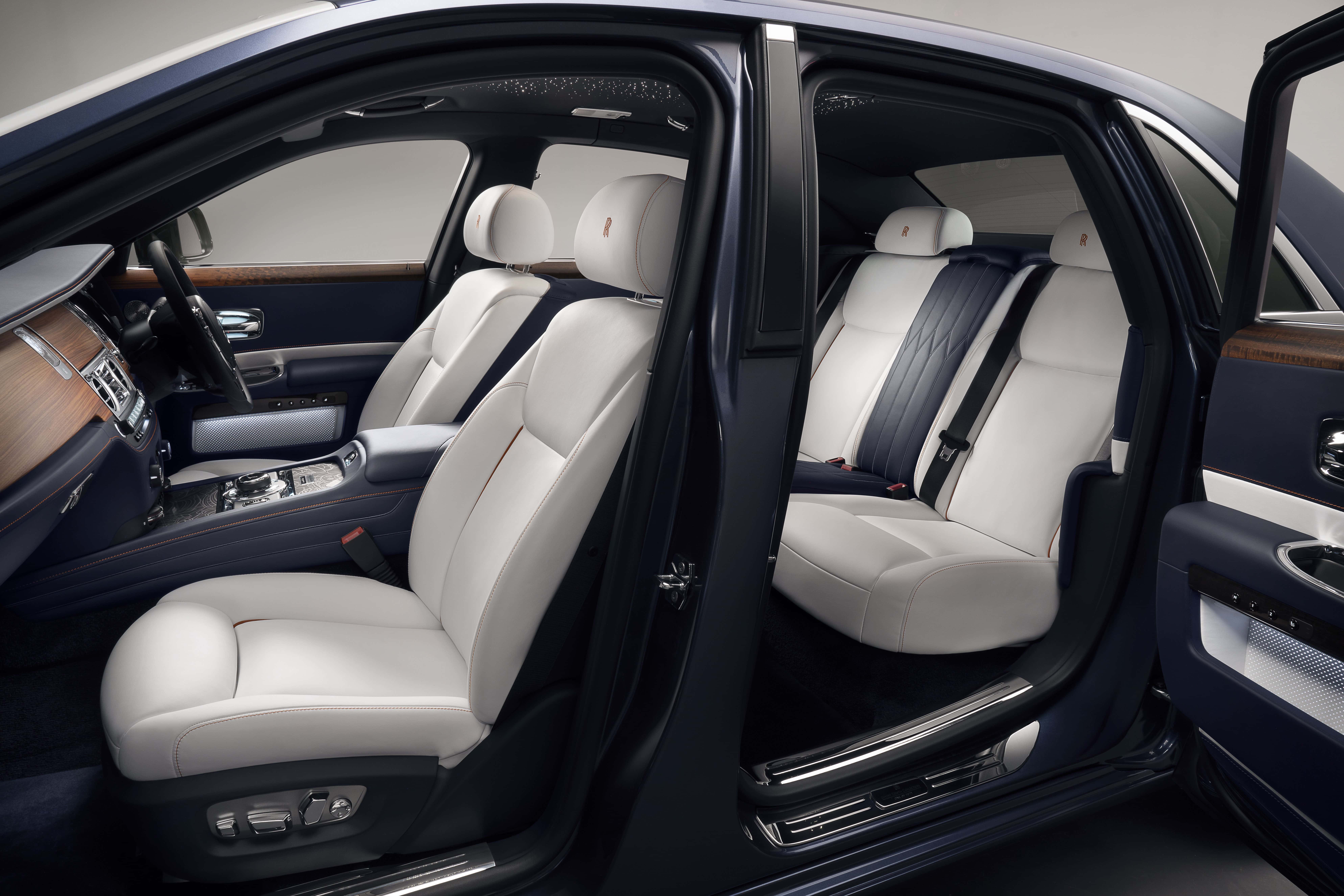 The rear seats feature embroidery that takes its inspiration from the seat details of the original 1907 Silver Ghost. This embroidery transitions from the rear to the front of the cabin. The seats have contrast stitching while customers can get dual paint jobs on the outside in only three color combinations: Iguazu Blue with Andalusian White, Premiere Silver with Arctic White or a daring Bohemian Red with Black Diamond.
