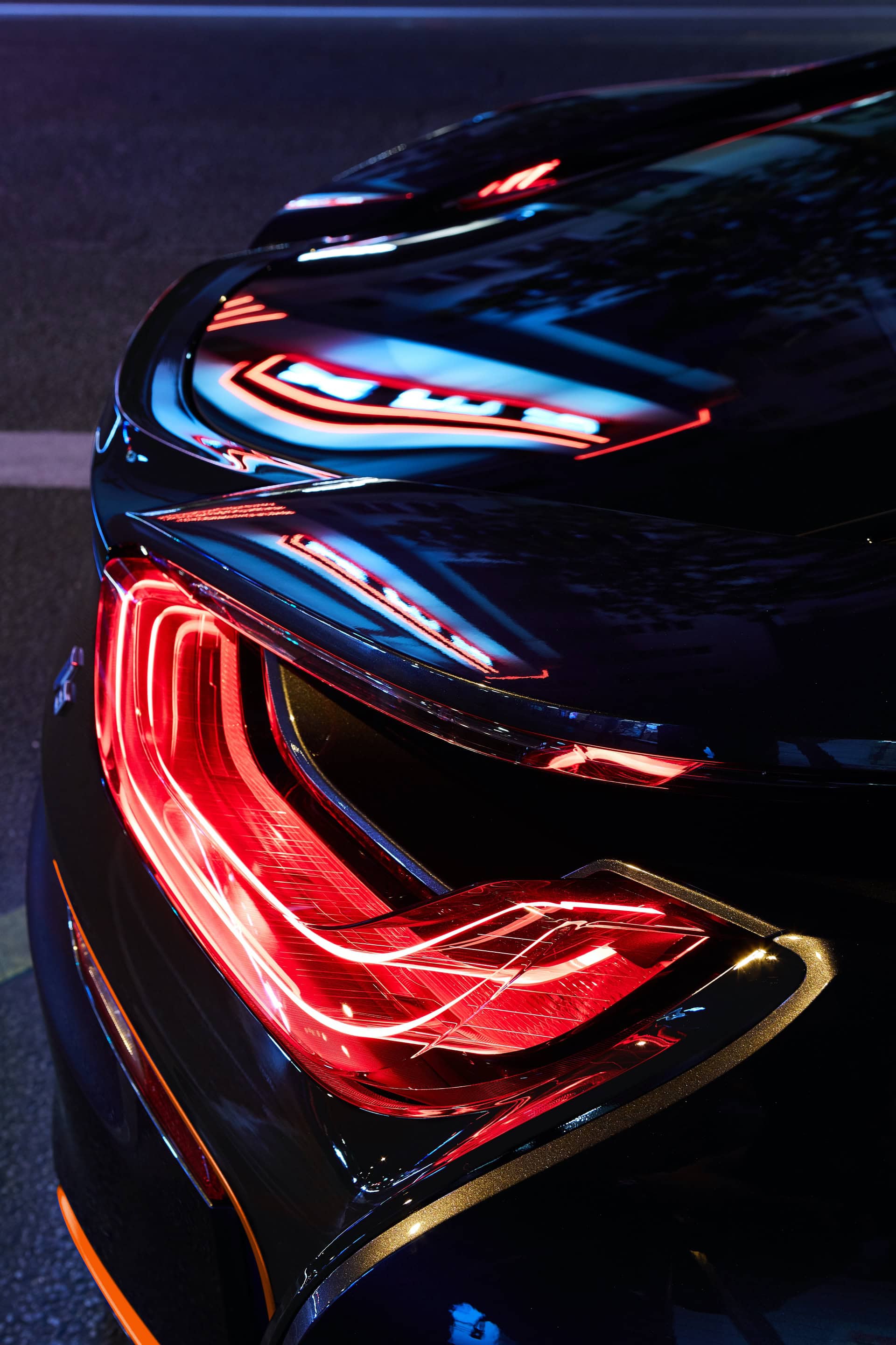 Both the i8 Coupe and Convertible feature Sophisto Grey metallic paint with E-Copper accents applied to the 20-inch radial-spoke BMW i light alloy wheels, kidney grille inserts and side skirt accent. The tailgate inlay is finished in High-gloss Black while C-pillar trim elements in Shadowline. The brake calipers are also painted High-gloss Black and feature blue detailing and BMW i badging.