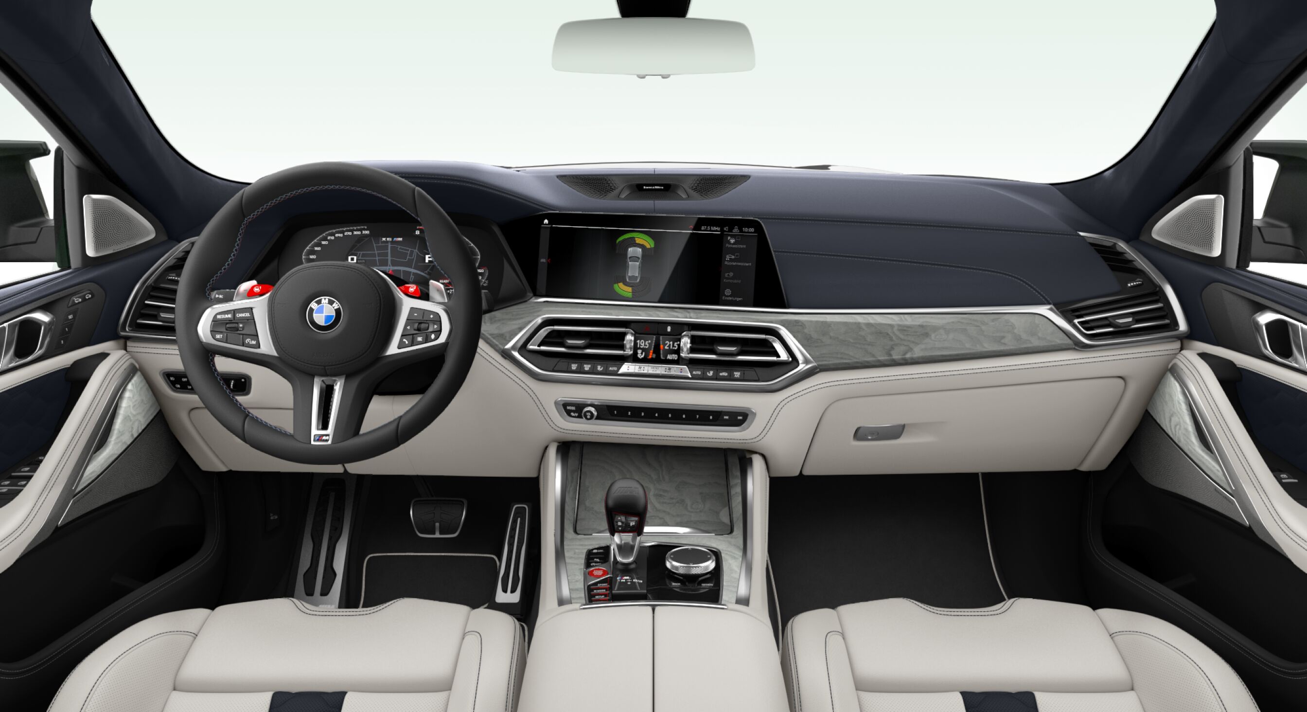 Secondly, I featured my favorite BMW X6 M Competition in a sparkling Donington Gray metallic exterior color. I specced the interior in the full leather BMW Individual Merino Ivory White/Night Blue upholstery, with the BMW Individual fine-wood Ash Grain Silver Grey high-gloss trim for the dashboard and door covers.