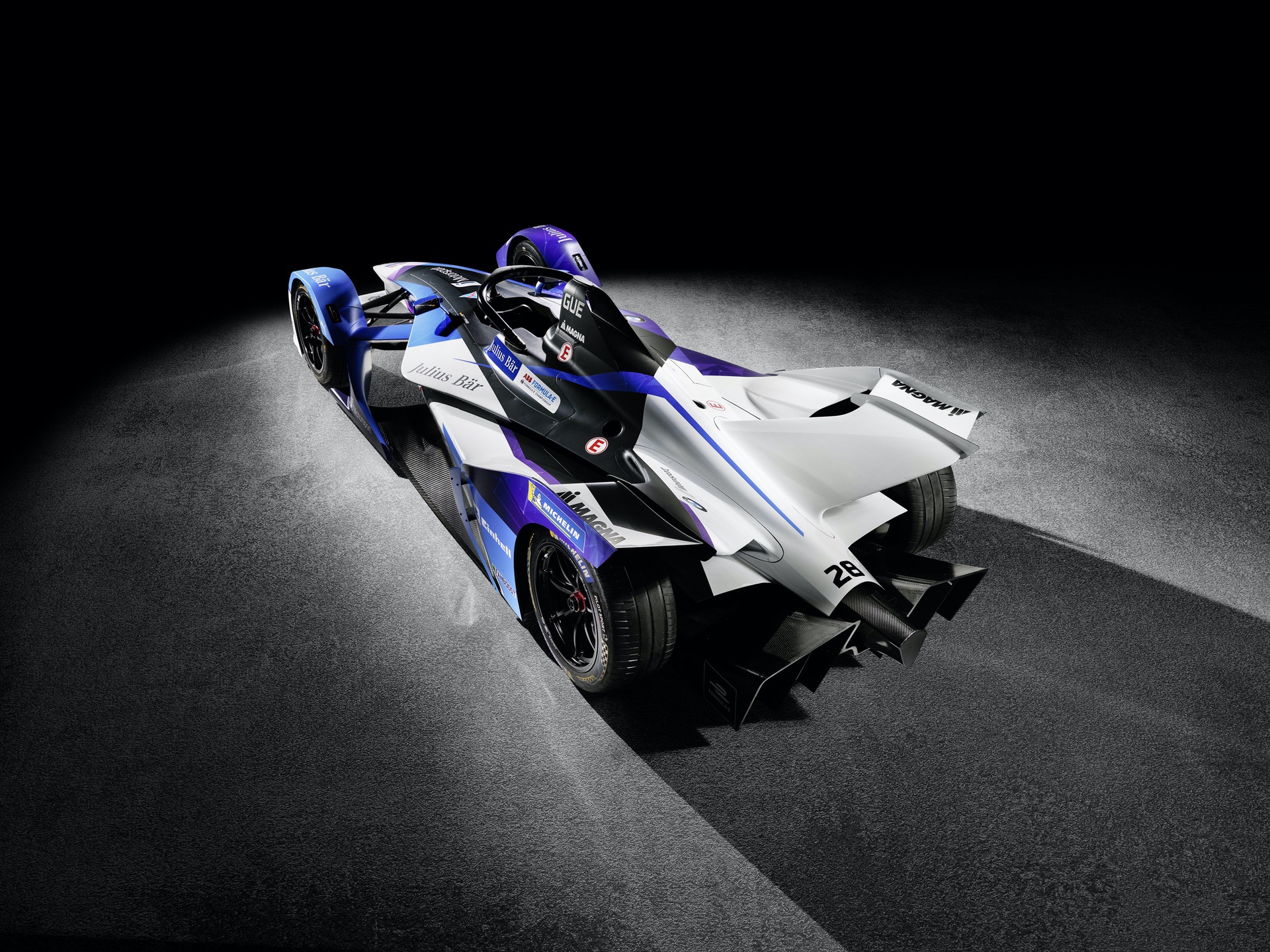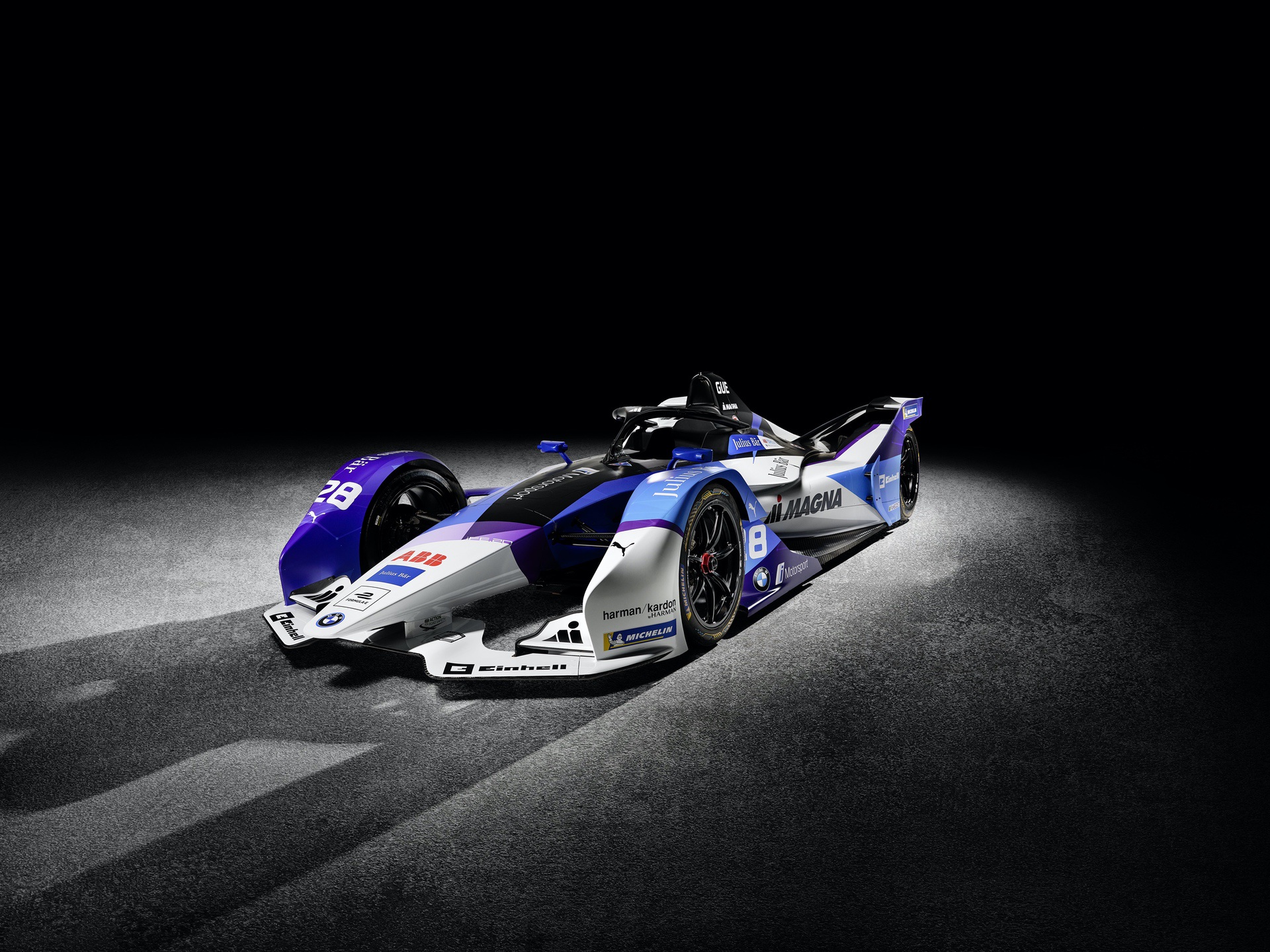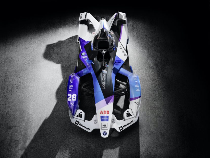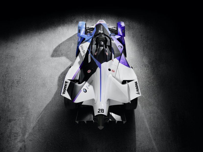 From the exterior, the slightly modified design of the BMW iFE.20 is evident. It maintains some of the elements of its predecessor, including the blue and white corners which intersect in the style of the BMW logo. The view from above has also been accentuated which, considering the usually elevated seating position of spectators at Formula E races, plays a particularly important role.