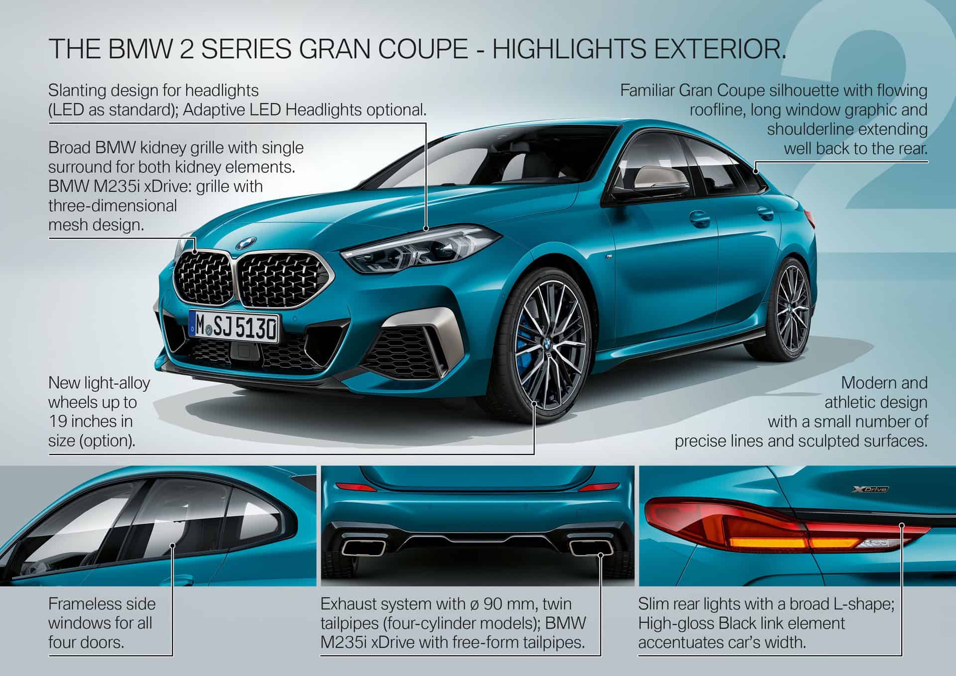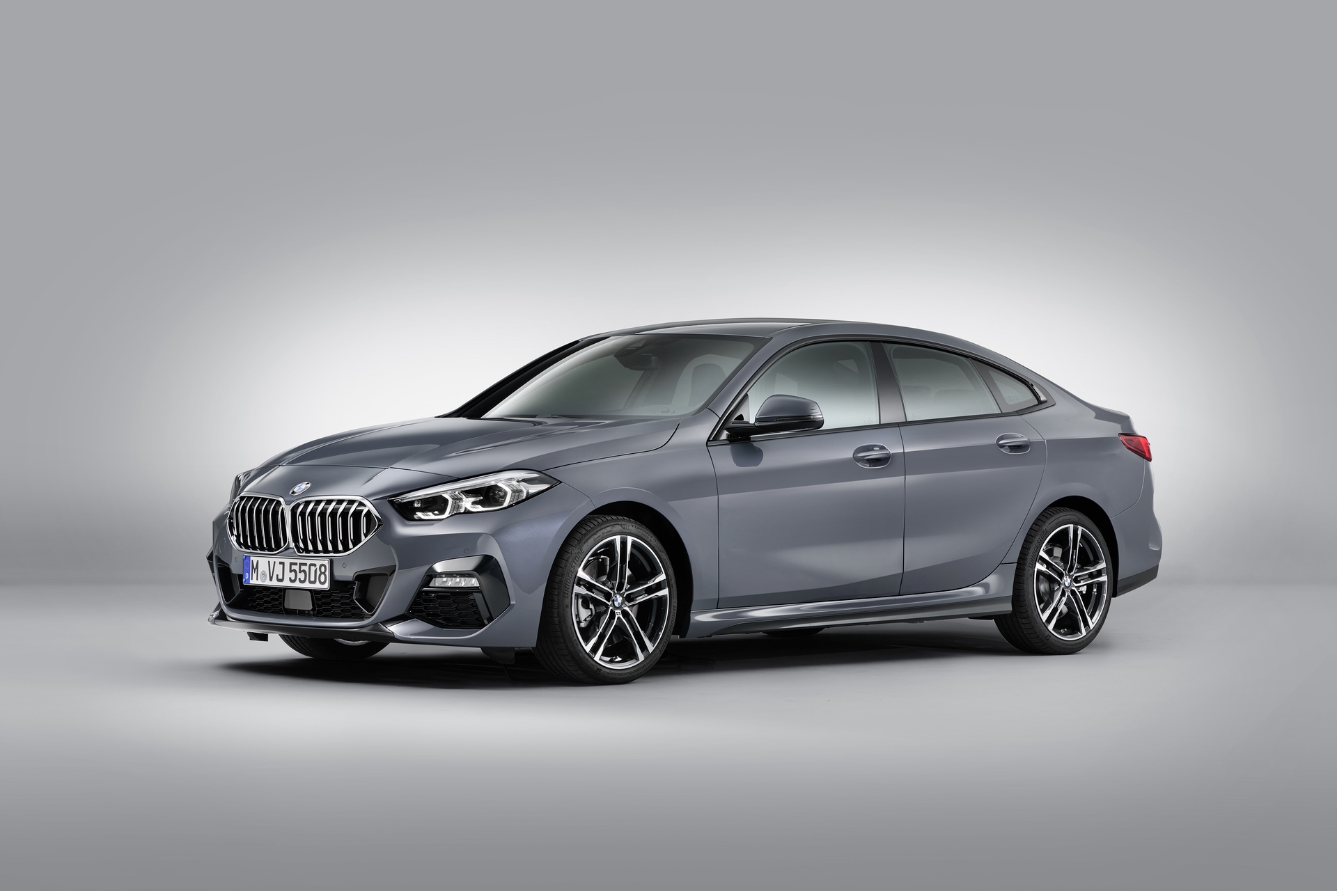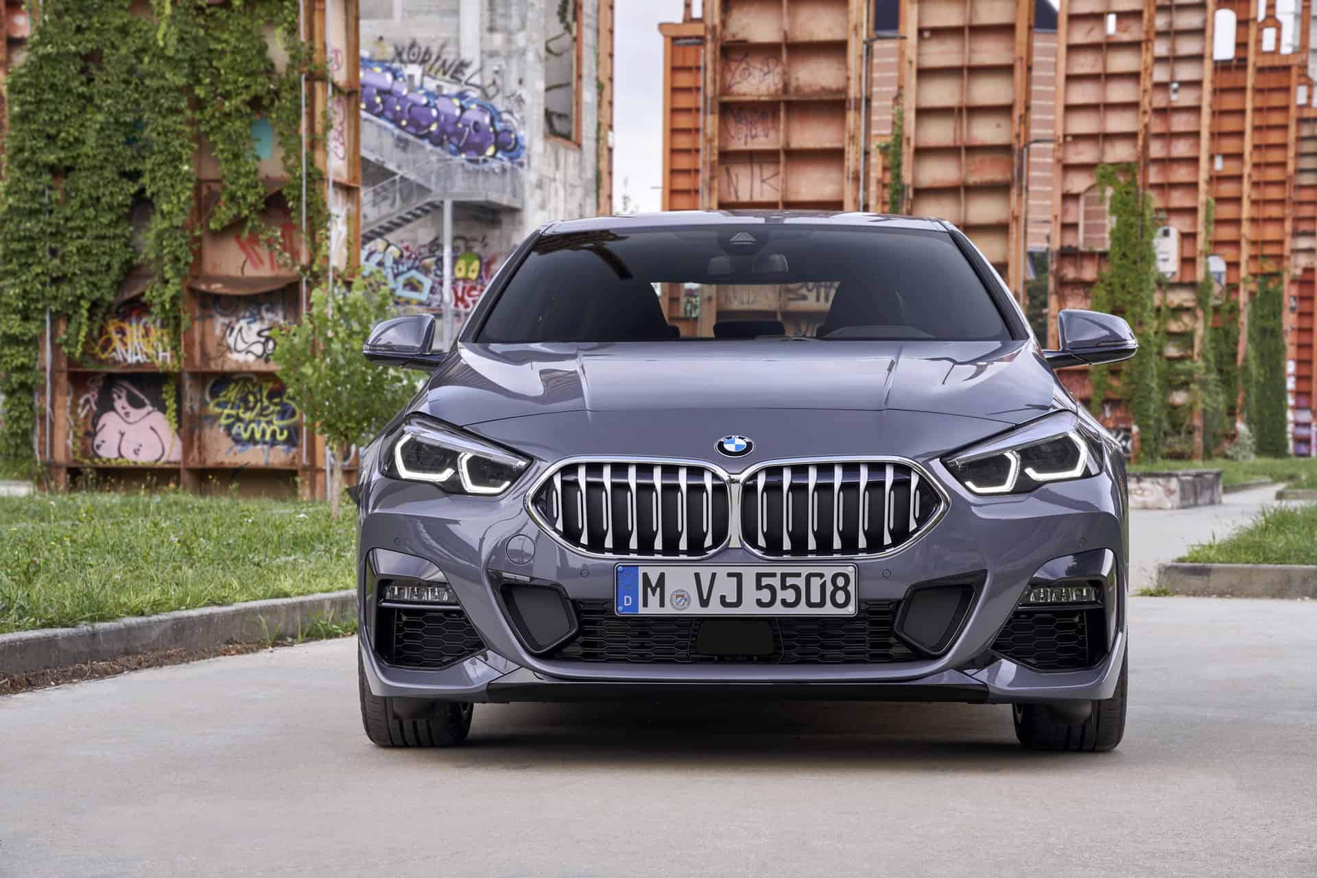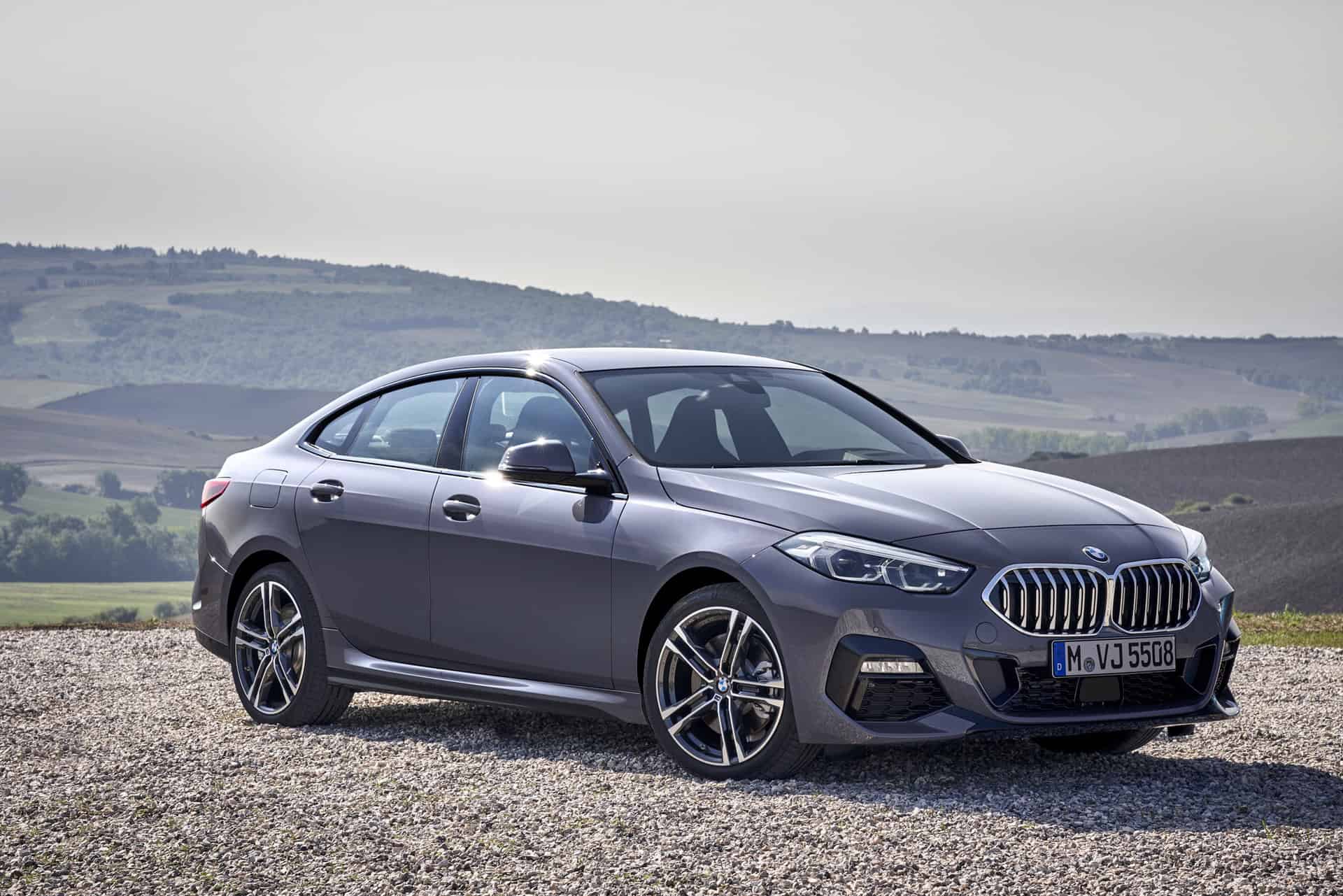 Seen here in M235i-spec, the 2 Series Gran Coupe looks very aggressive. It gets massive front air intakes and little vertical vents next to them. It also gets the typical M Performance brushed aluminum-look mirror caps and the new Kidney Grille insert pattern.