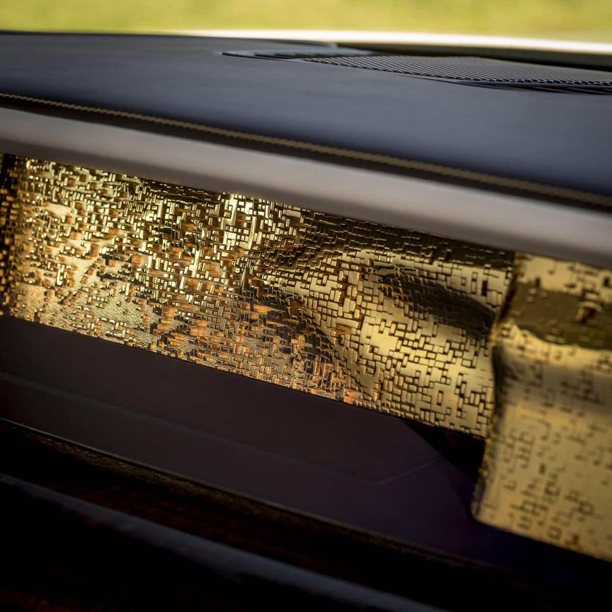 In the cabin, the dashboard Gallery displays the tridimensional image of an intricate binary algorithm. Data is transcribed using the art of 3D printing, forming the largest piece of 3D printed stainless steel ever featured in a production car. This stainless steel has been plated in nearly 50g of 24-carat gold. Parts of the algorithm are repeated onto the wood trims covering the back sides of the front seats and the door covers.