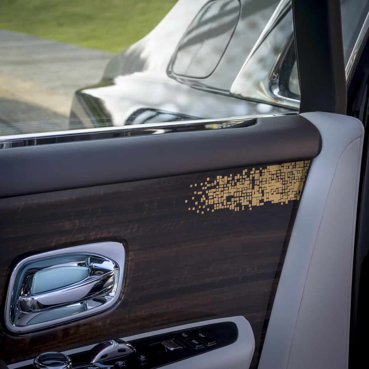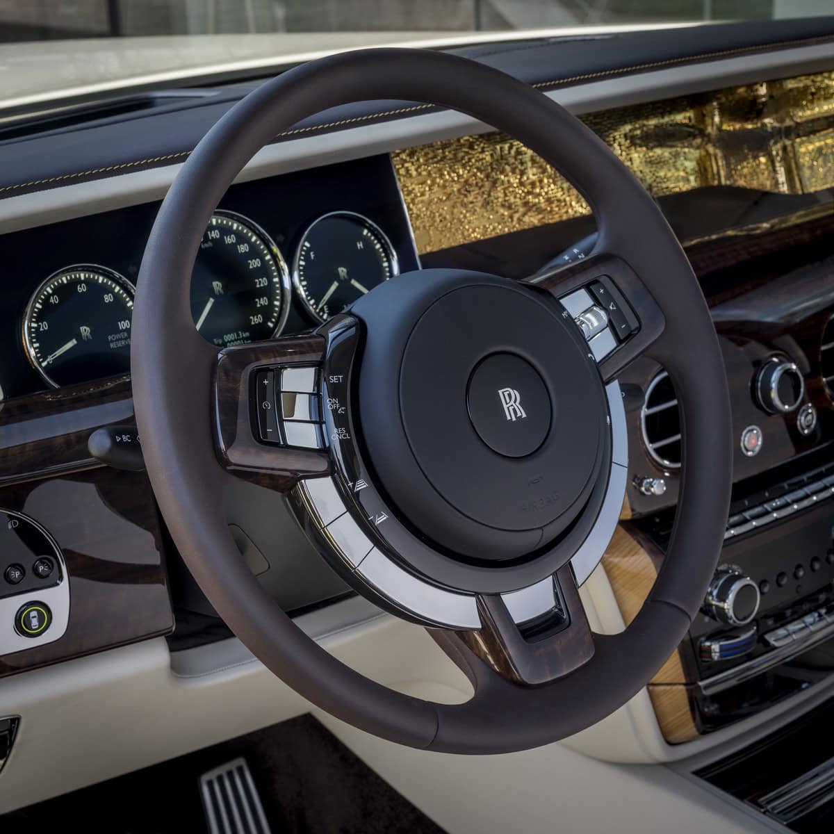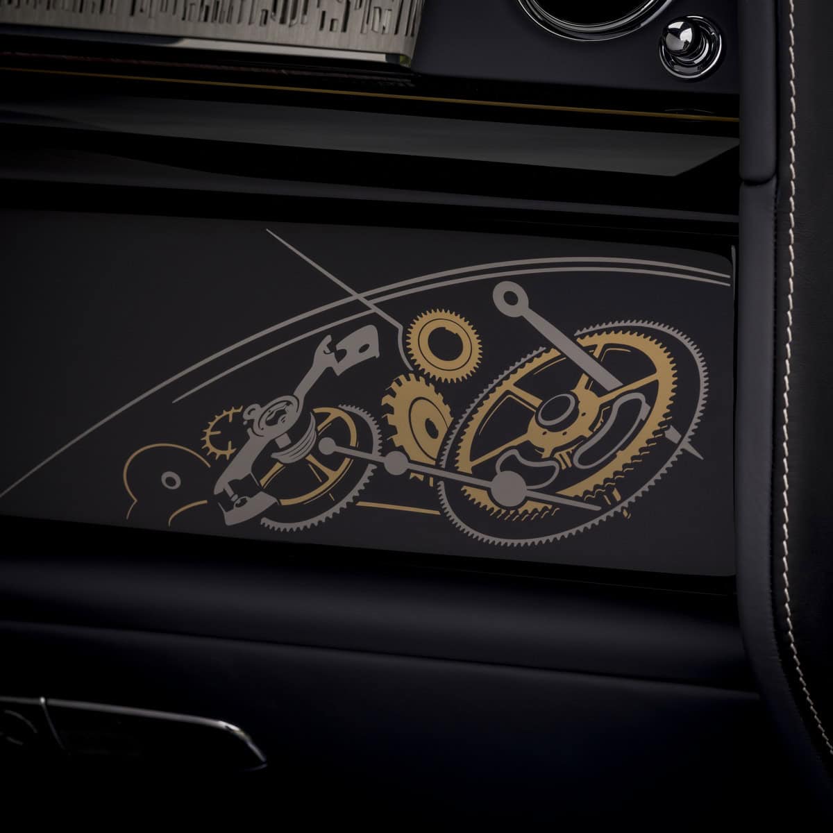 Gold and Silver hues set against the Gunmetal lower and Black upper two-tone exterior paint hint at the holistic theme of this motor car. A gold and silver coloured hand-painted twinned coachline incorporates an intricate watch inspired design, whereas the Spirit of Ecstasy is finished in 24-carat gold. The bespoke Phantom inspired from the world of horology also features a special dashboard Gallery inlay which depicts an abstract schematic of a watch movement.