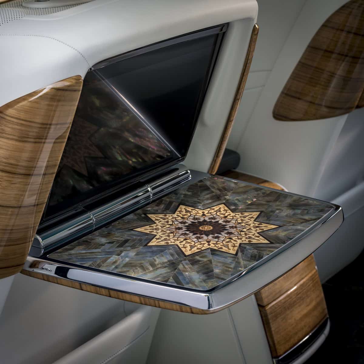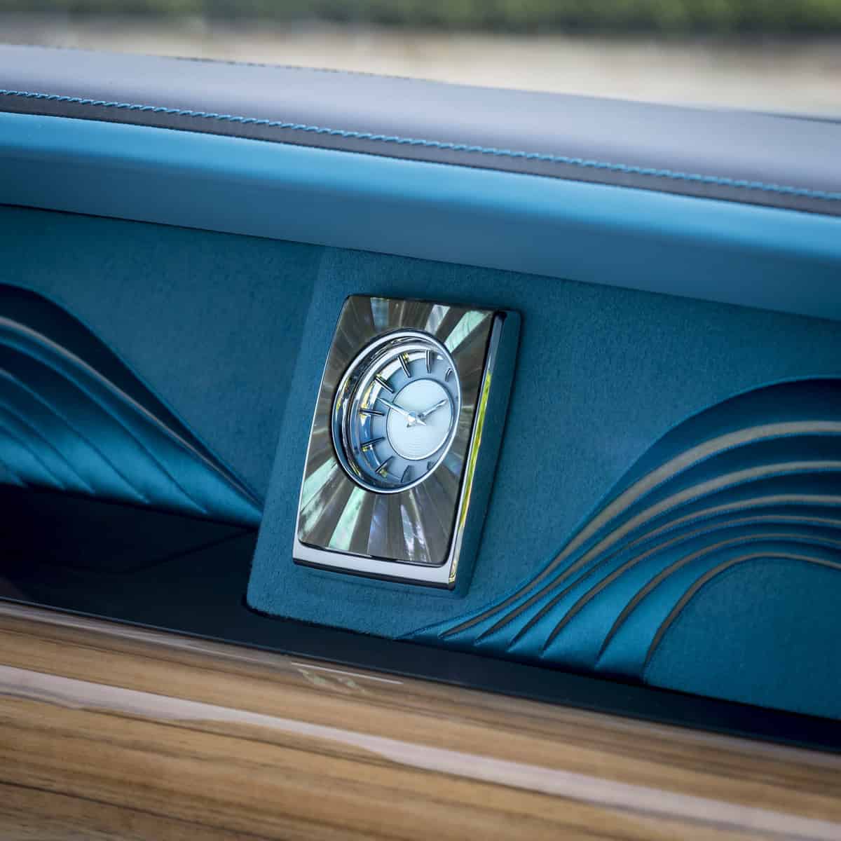 The shell motif is also present in the interior of this Arabian Gulf Phantom, where it can be seen embossed in the leather door covers and the wood trims of the front seats. A Mother of Pearl clock highlights the vibrant Turchese Gallery. The silk appliqué lines flow through the Gallery and further attract attention towards the centrepoint clock. The starlight headliner with its 1,344 hand-woven optic fibre projectors is covered in Turchese-coloured leather, delivering an uber-premium feel atmosphere.