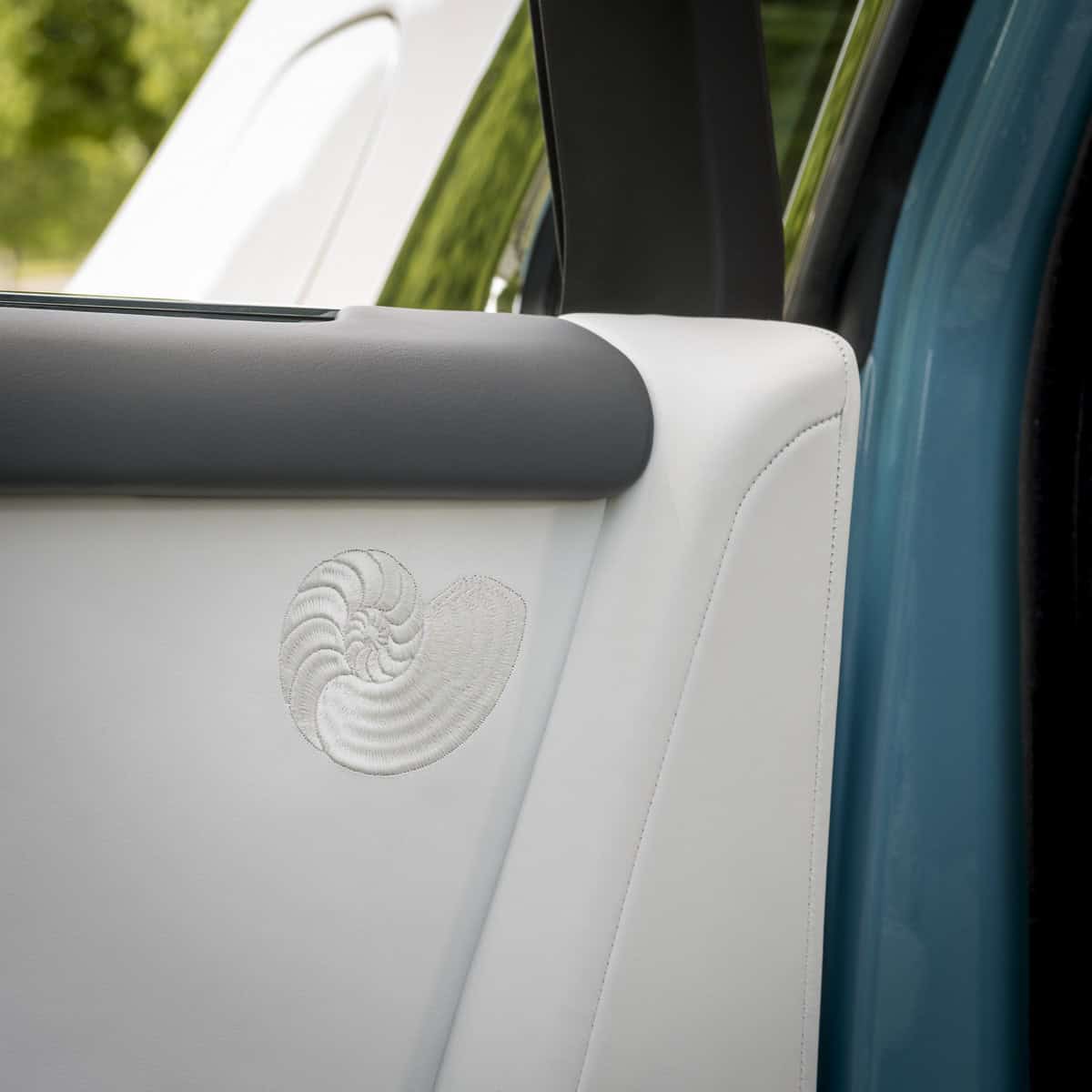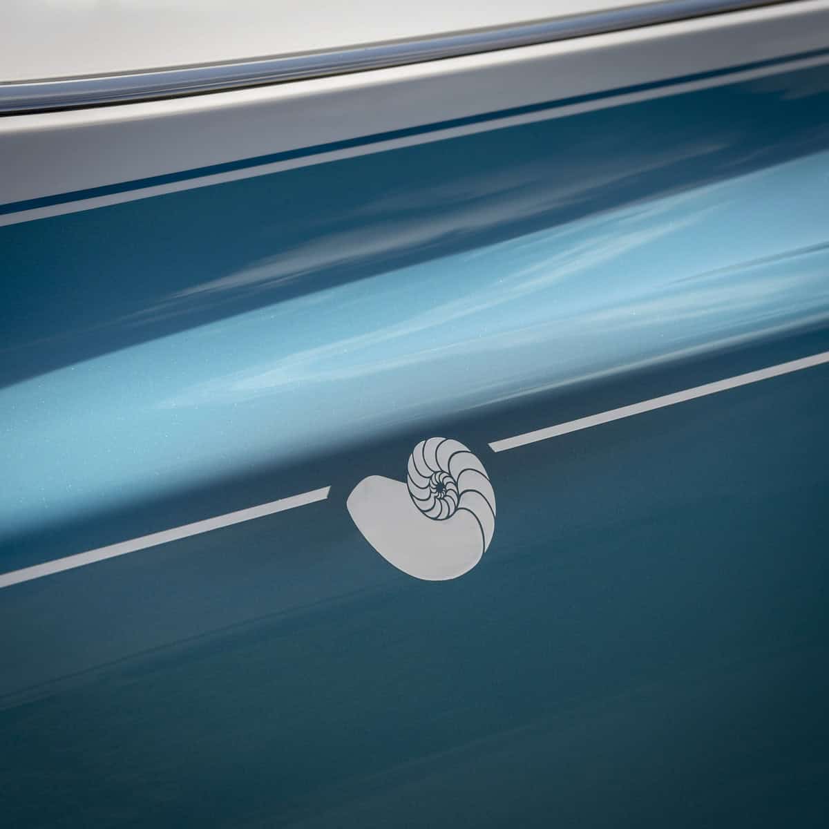 The Arabian Gulf Phantom adopts the rich colors and historical narrative of pearl diving in the Middle East. The Turchese exterior hue is evocative of the vibrant local waters, while the Andalusian White upper two-tone recalls the purity of natural pearls. On the exterior, along the coachline, a Nautilus shell motif is featured.
