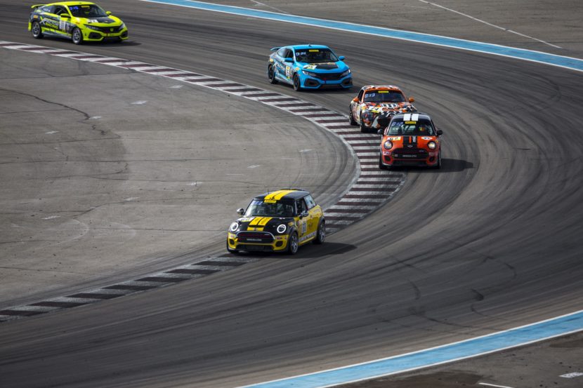 Race one saw the team score a double podium with Mat Pombo in the #61 MINI JCW and Mark Pombo in the #59 MINI JCW, crossing the line in second and third place, respectively. As the team headed into race two, it seemed to be the class of the field. The MINI JCW race cars ran 1-2-3 for the majority of the race, with Mat leading the way. Nate Norenberg in the #60 and Tomas Mejia in the #62 Pledge to Humanity MINI JCW held down the next two positions under intense competition.