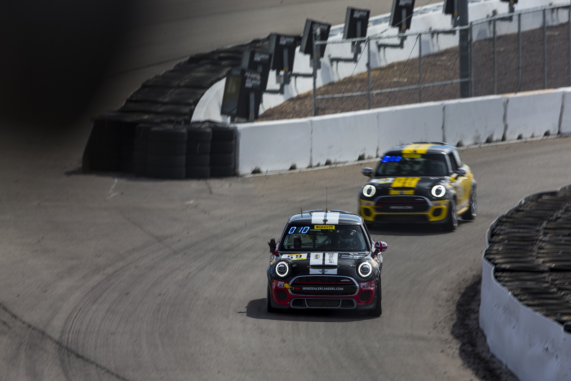 Race one saw the team score a double podium with Mat Pombo in the #61 MINI JCW and Mark Pombo in the #59 MINI JCW, crossing the line in second and third place, respectively. As the team headed into race two, it seemed to be the class of the field. The MINI JCW race cars ran 1-2-3 for the majority of the race, with Mat leading the way. Nate Norenberg in the #60 and Tomas Mejia in the #62 Pledge to Humanity MINI JCW held down the next two positions under intense competition.