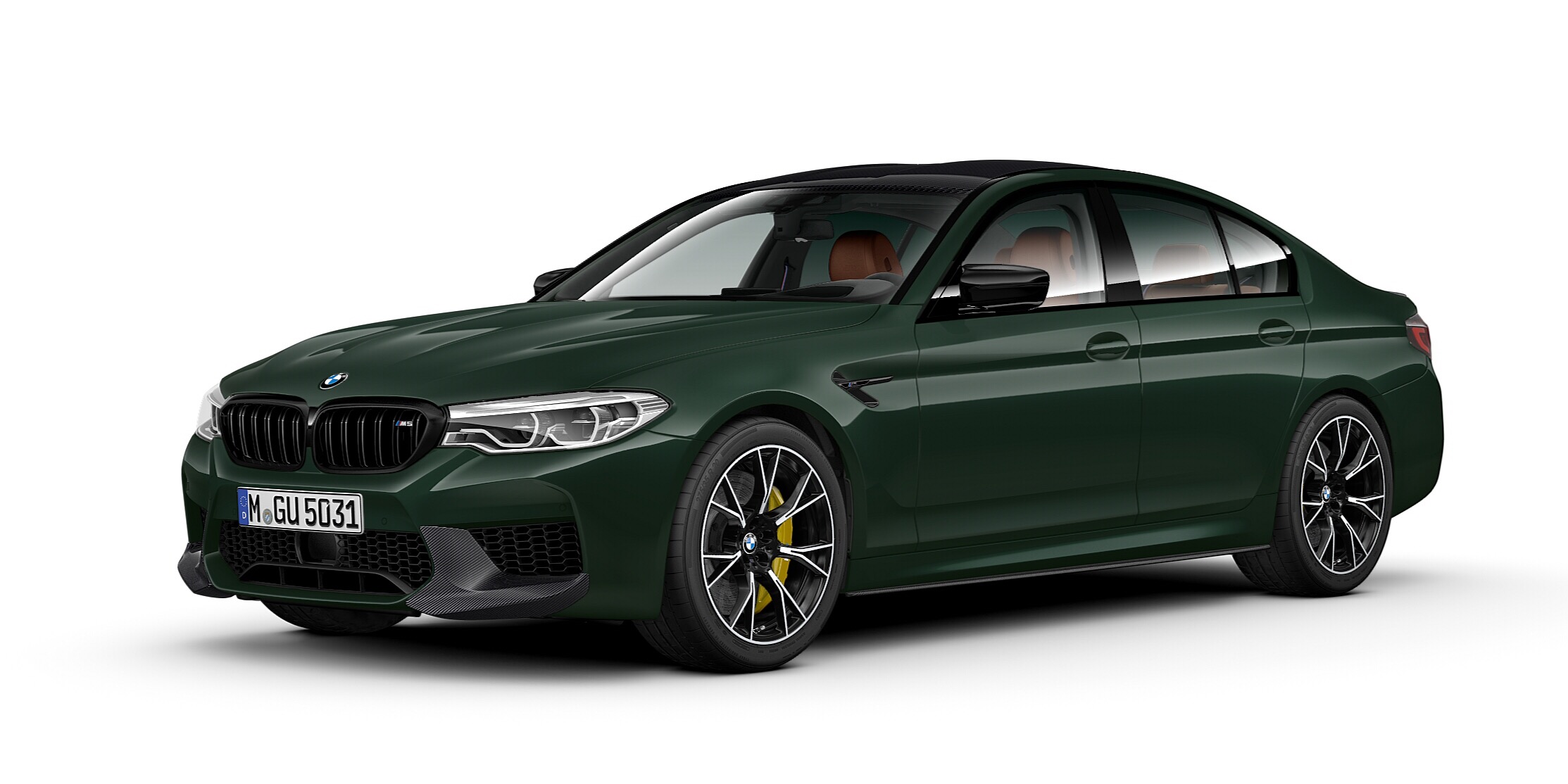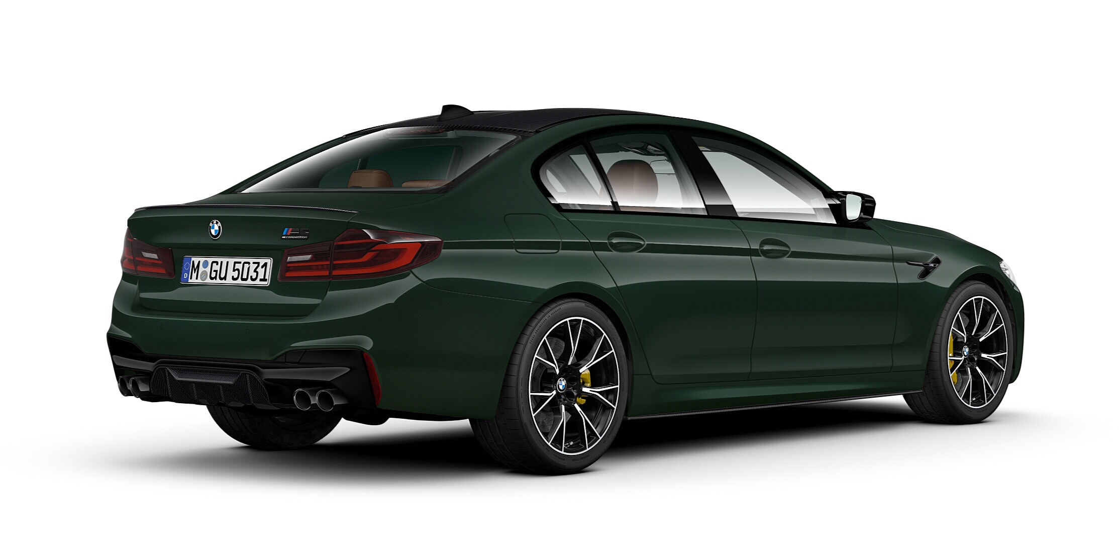 The 625 PS (617 hp) high performance sedan is specced in a deep and powerful green shade: the BMW Individual British Racing Green (code 312), harking back to the classic days of motorsport. The exterior looks are further enriched with the standard BMW Individual high-gloss Shadow Line details. The BMW M5 Competition is sitting on the 20-inch alloy wheels fitted with sport tires, with Y-spoke 789 design and colored in Orbit Grey and sporting a polished look.