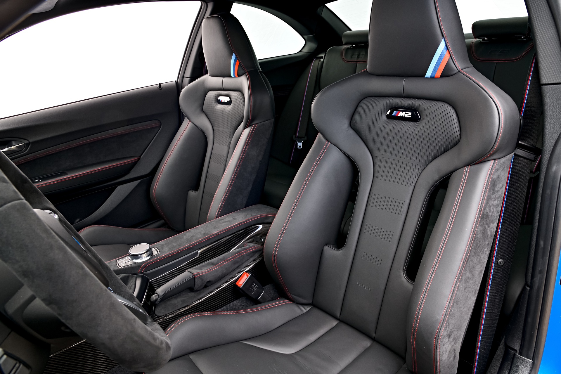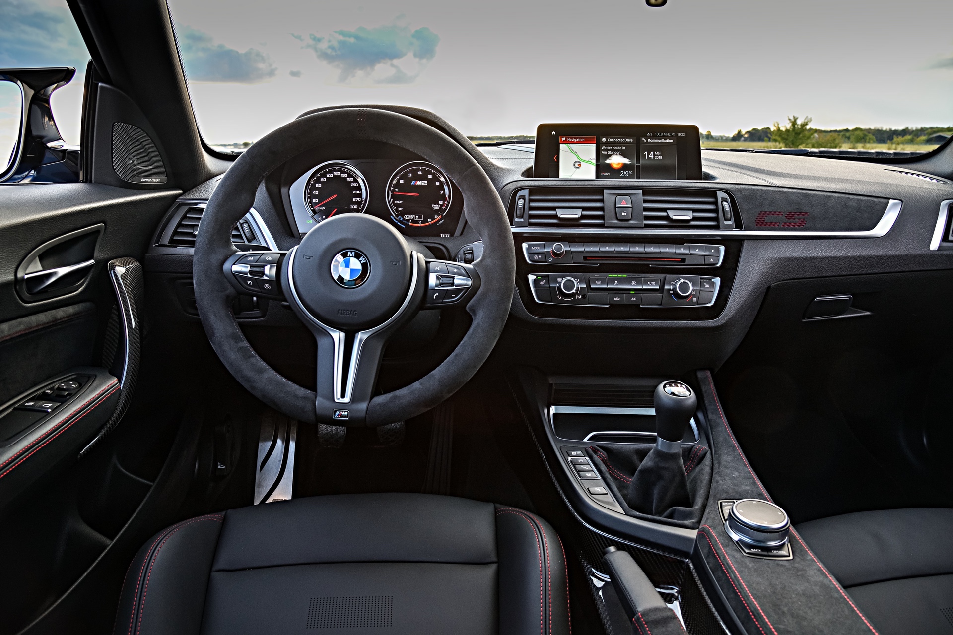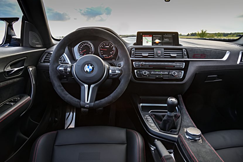 Inside, the BMW M2 CS feels as lightweight as it is. So it gets carbon fiber door pulls and door panel trim, as well as Alcantara everywhere and seemingly miles of contrast stitching. The center console is also made entirely of carbon fiber, which reduces weight by 50-percent over the standard car’s (around 6 lbs/2.7 kg). There’s also an uber-thick Alcantara steering wheel. For anyone that’s seen the interior of the BMW M4 CS, this will look very familiar. The M Competition seats are covered in black leather and Alcantara and feature the CS logo on the integrated headrests.