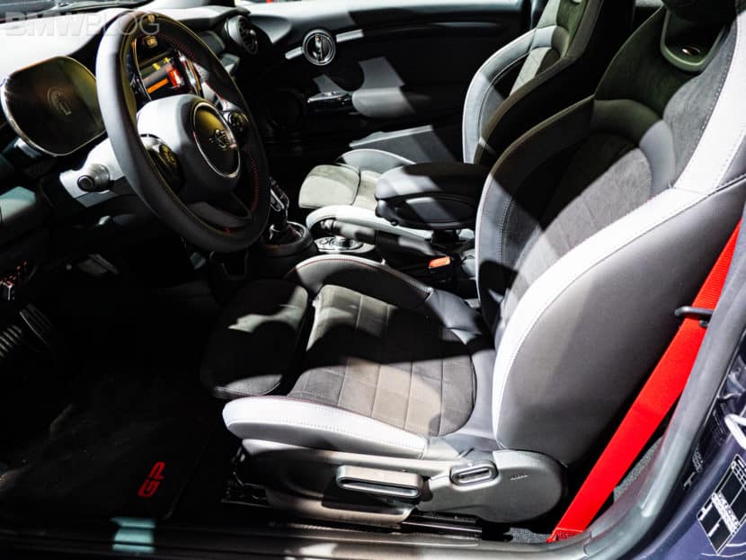 Inside, the standard equipment includes John Cooper Works sports seats in Dinamica/leather combination with silver side edges, red accentuation seams, a GP badge underneath the integrated headrests and red belt straps. The interior trim on the passenger side bears the numbering of the respective vehicle. This is produced individually by 3D printing.