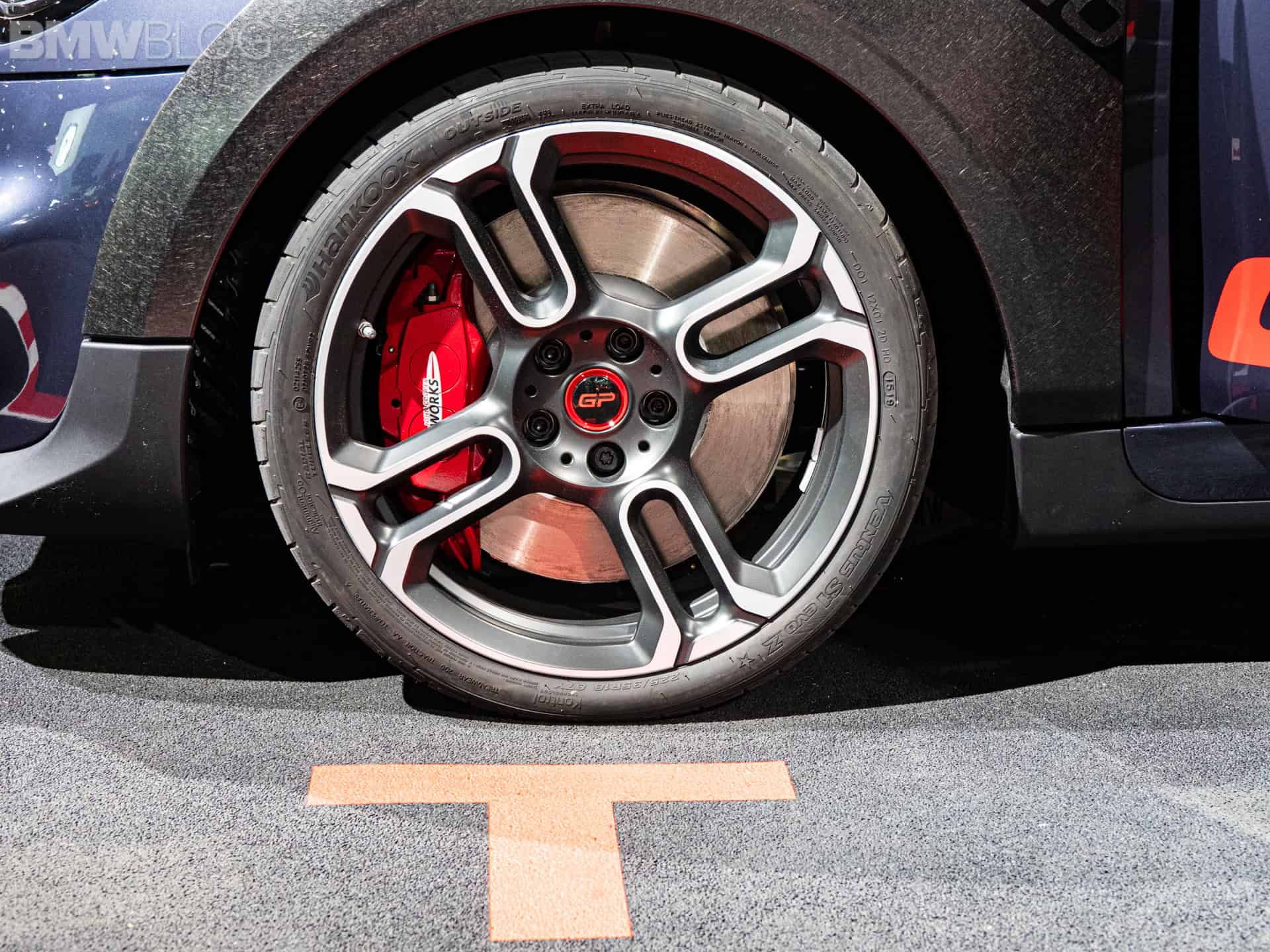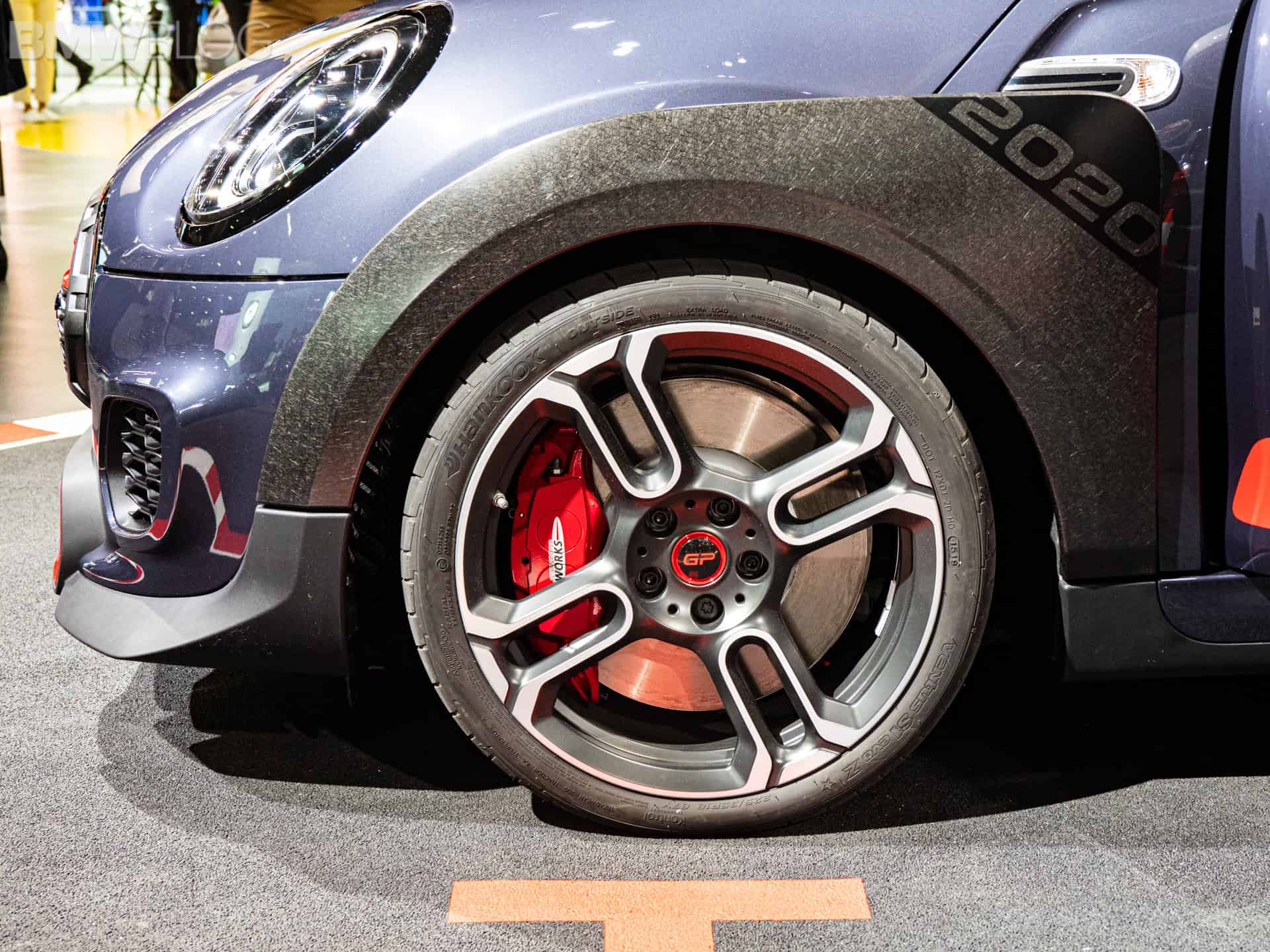 The JCW GP includes large and strikingly flared wheel arches consisting of a thermoplastic substructure and an outer shell made of carbon fibre-reinforced plastic (CFRP).