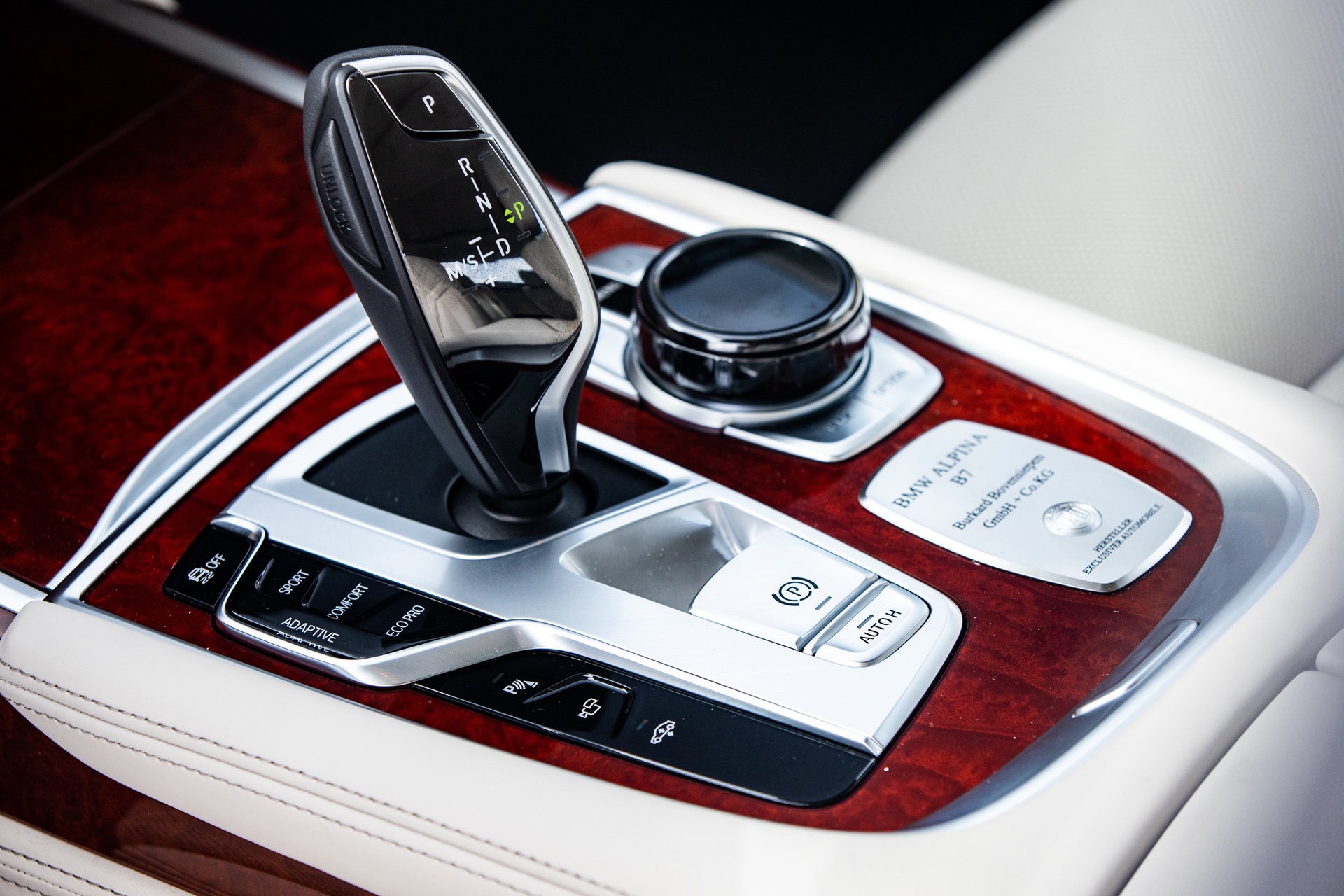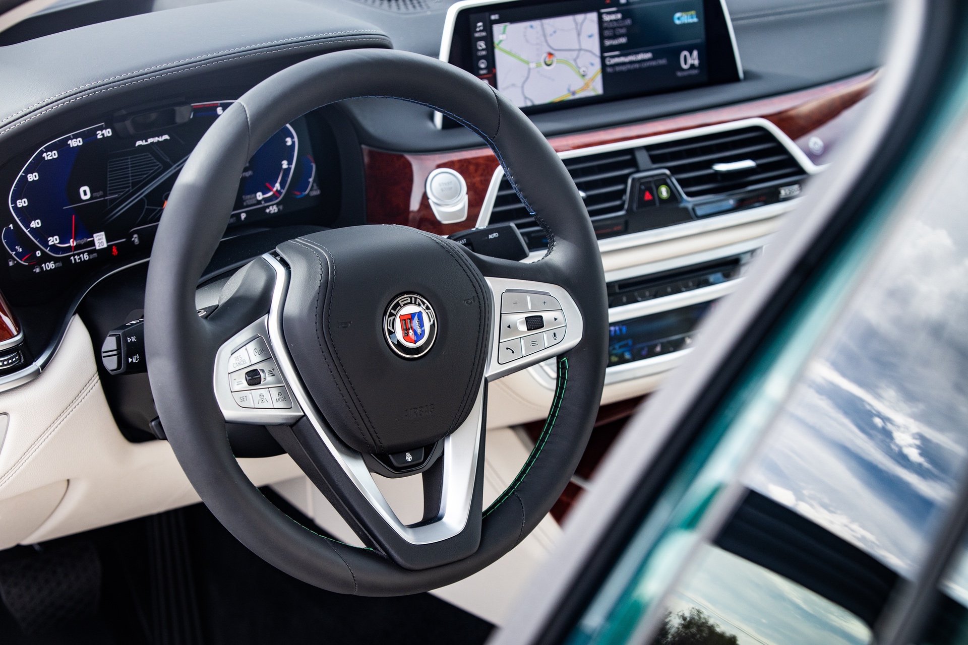 Inside, the hand-finished using exceptionally high-quality LAVALINA leather, the sports steering wheel with blue and green stitching is captivating at the very first touch due to its luxurious feel. Contemporary Piano lacquer or classic Myrtle Luxury Wood interior trim, door sills with blue illumination, ALPINA B7 model inscriptions and an individual production plaque are examples of exclusive equipment features.