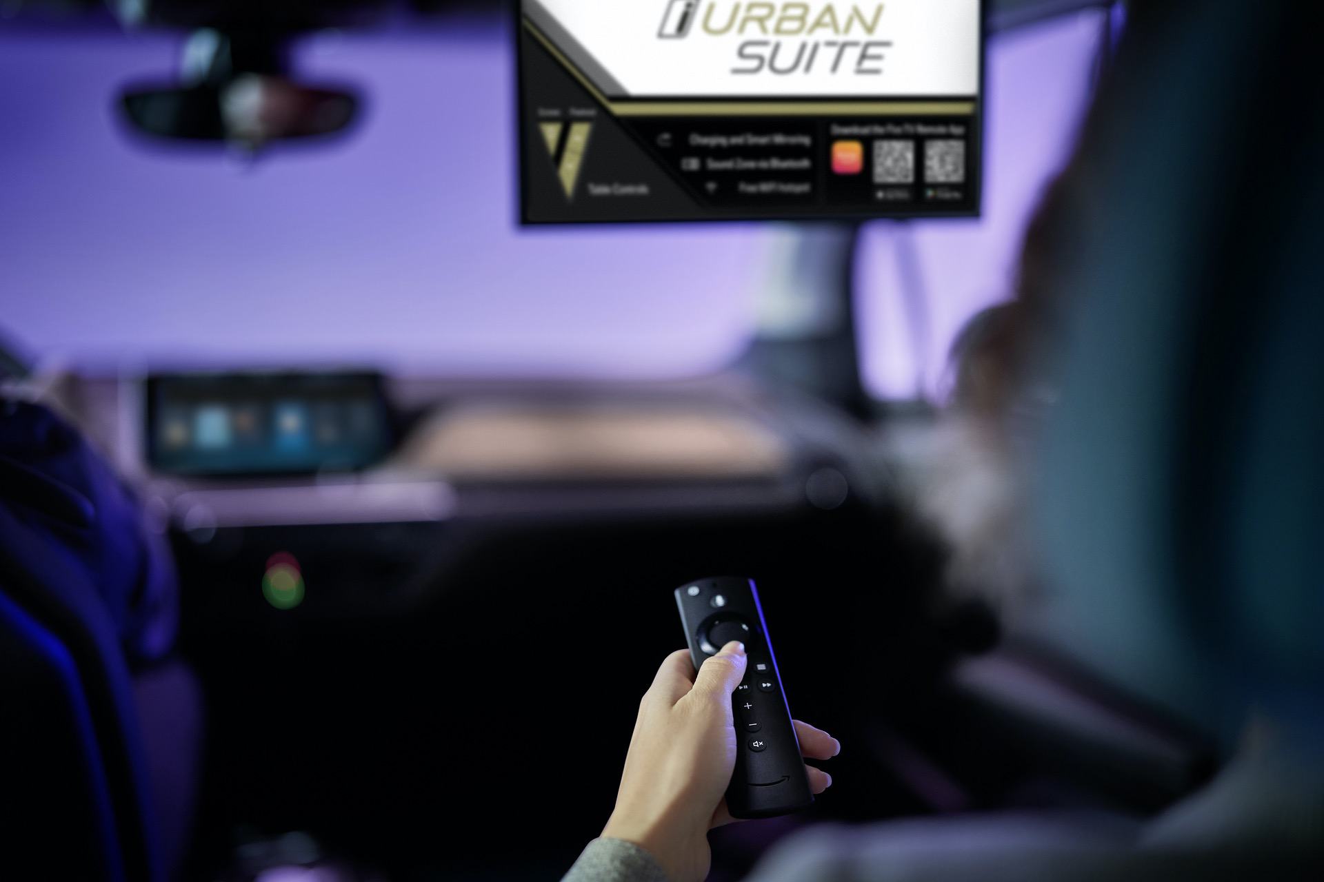 Once inside the BMW i3 Urban Suite, the passenger can connect their iPhone to the car wirelessly and also mirroring their mobile device’s content to the flip-down overhead screen and then work on the screen. A screen flips down from the headliner so passengers can now watch their favorite shows and movies via Amazon Fire TV. The on-demand access to vast content catalogs and voice control can be initiated through Amazon’s Alexa.