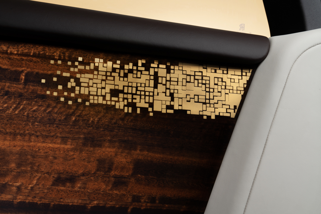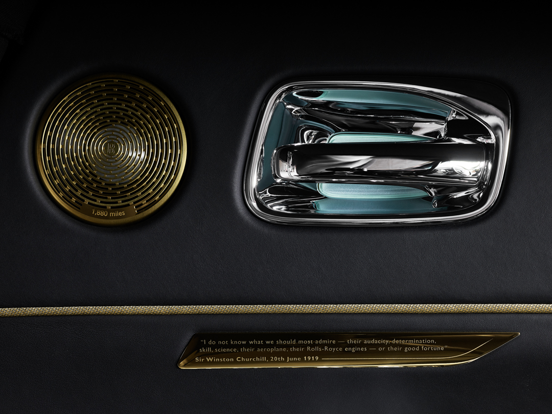 The Wraith “Eagle VIII” honors the first-ever, non-stop transatlantic flight by Alcock and Brown in June, 1919, which was powered by Rolls-Royce Eagle VIII engines. Rolls created 50 of these unique machines, which feature a unique starlight headliner that replicates the night sky above them during their trip in June, 1919. The flight path and constellations are embroidered in brass thread and the exact moment the pair left the clouds, also illustrated in embroidery, and navigated by the stars is indicated by a red fiber-optic light. Brass speaker covers depict the estimated 1,880-mile flight distance whilst a brass plaque engraved with Winston Churchill’s stirring quote commending the pair’s remarkable achievement adorns the driver’s door. The Smoked Eucalyptus fascia, vacuum metalized in gold and inlaid with silver and copper, depicts a birds-eye view of the Earth at night, showing a light map of roads and homes glittering below.