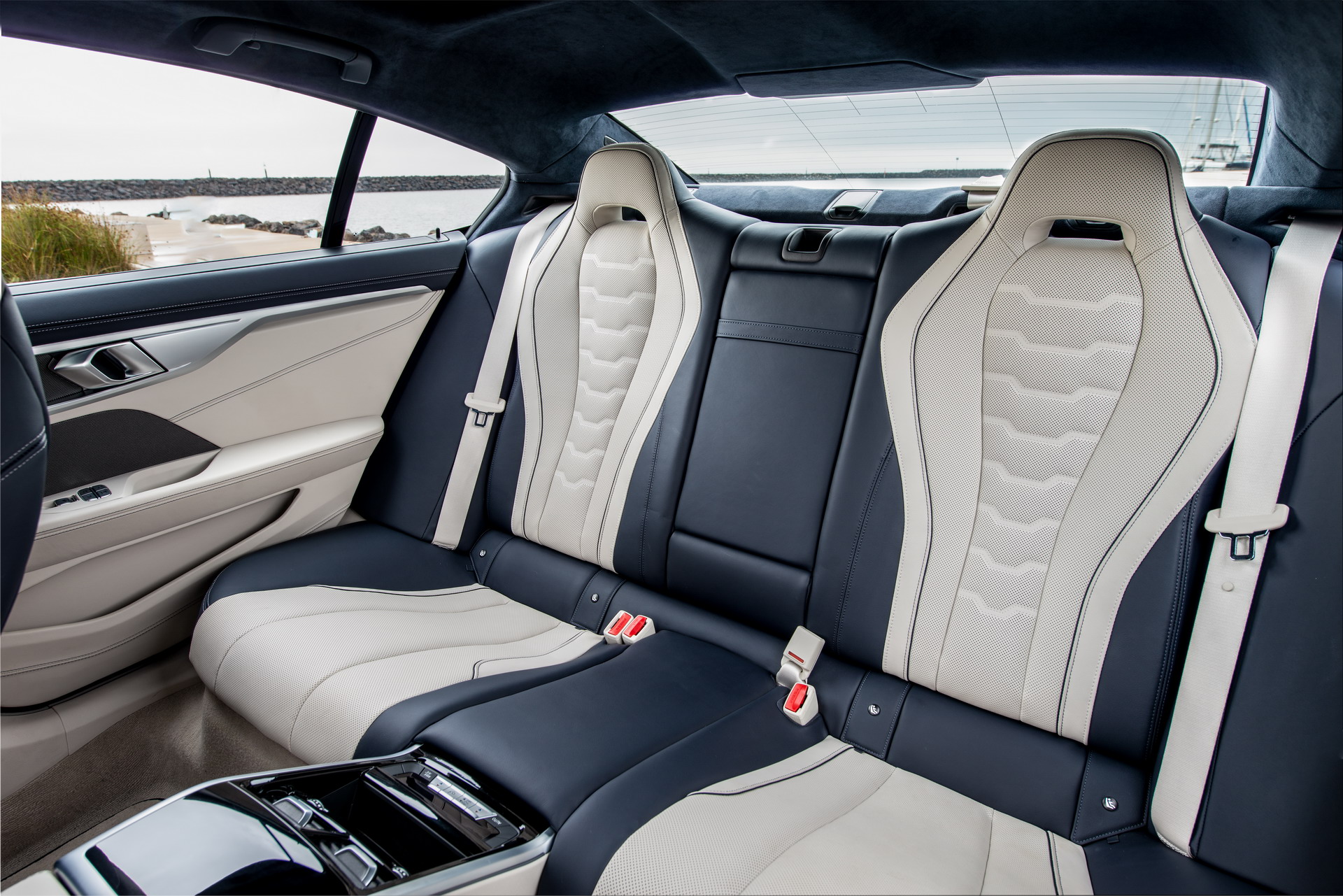 The interior of the M Performance four-door 8 Series boasted a full Merino Ivory White/Night Blue leather upholstery, complete with the CraftedClarity glass ornaments and the Piano high-gloss black wood trims.